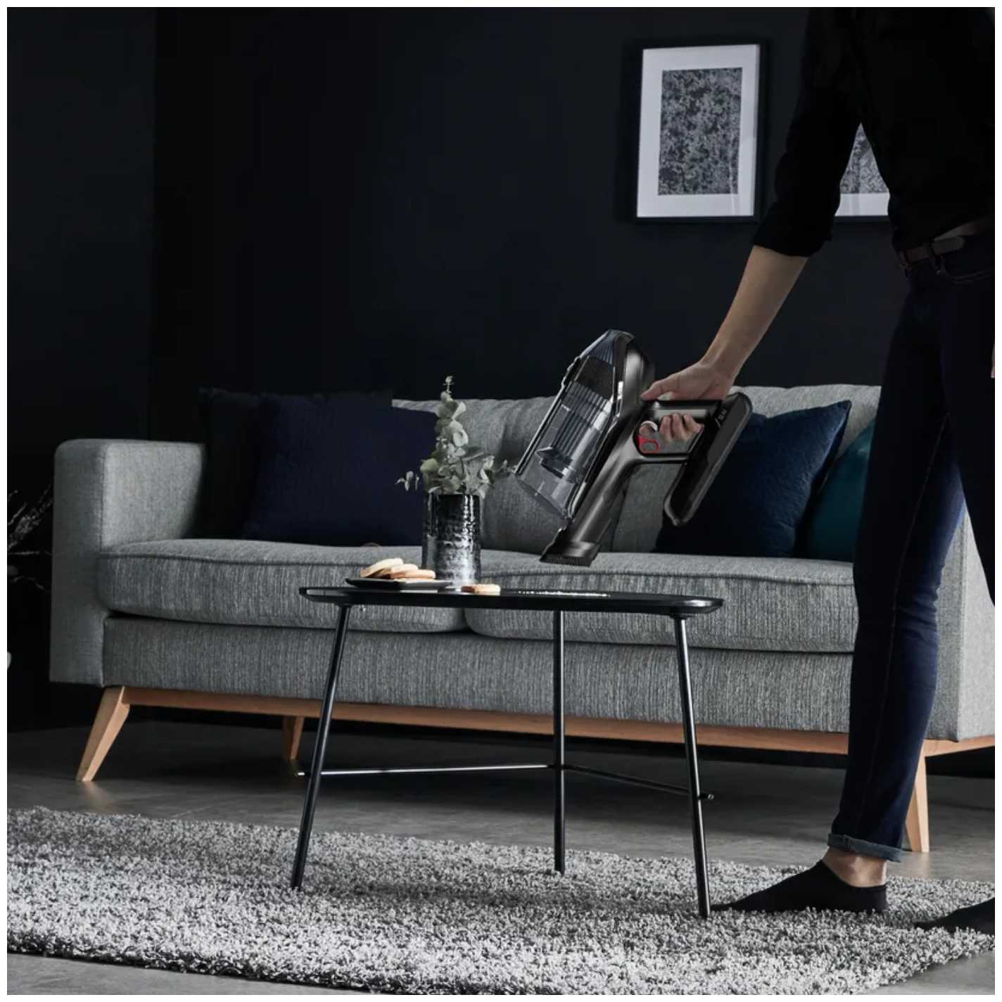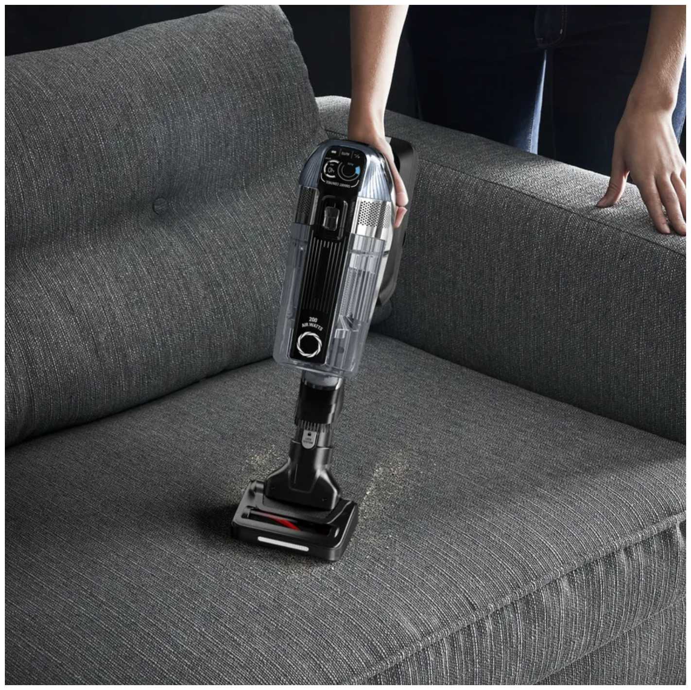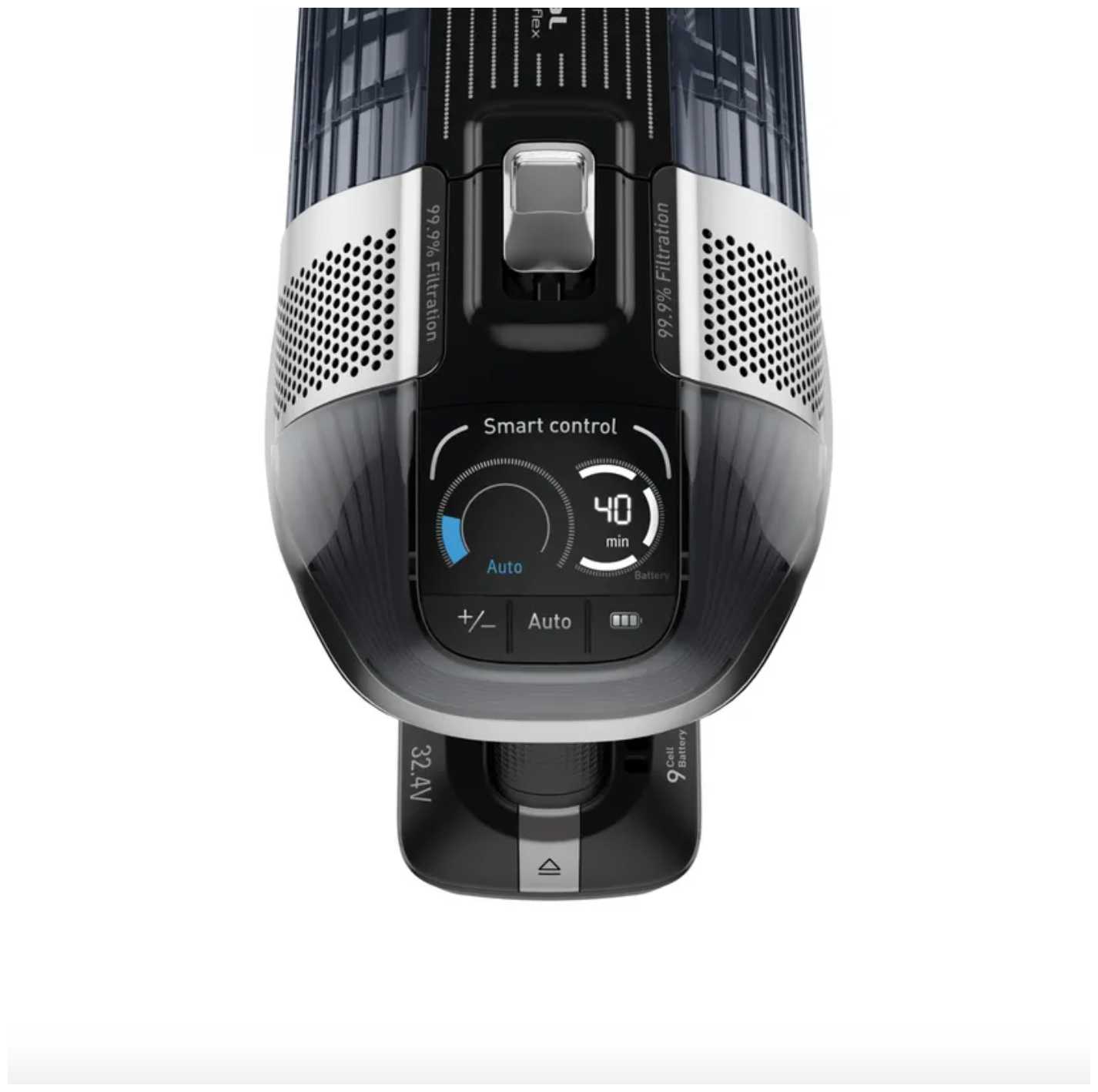 Эргономичная рукоятка с прорезиненными вставками предотвращает скольжение, а балансировка снижает нагрузку на кисть. Дисплей на корпусе отображает точное время работы до разряда (в минутах) и активный режим. Кнопка включения фиксируется без постоянного удержания, что упрощает длительную уборку. -