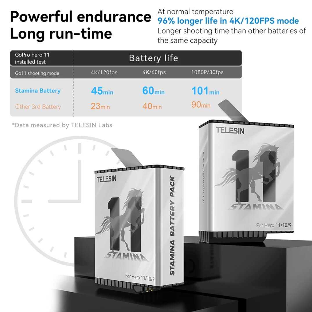 | Комплектация : | 1x Зарядное устройство Telesin, 2x Аккумулятора Stamina, 1x Зарядный кабель USB-C |