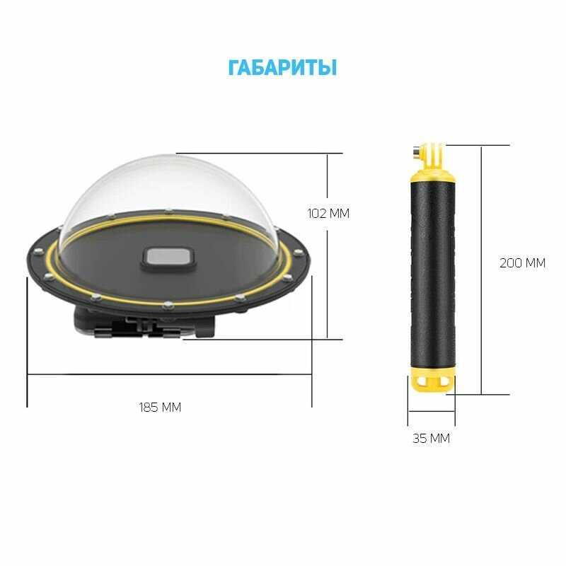 Комплектация : | Купол, ручка поплавок, салфетка, ручка для нажатия спуска затвора на куполе, ключ, длинный винт, антизапотевающие вставки - 6 шт., ремешок на руку, чехол |