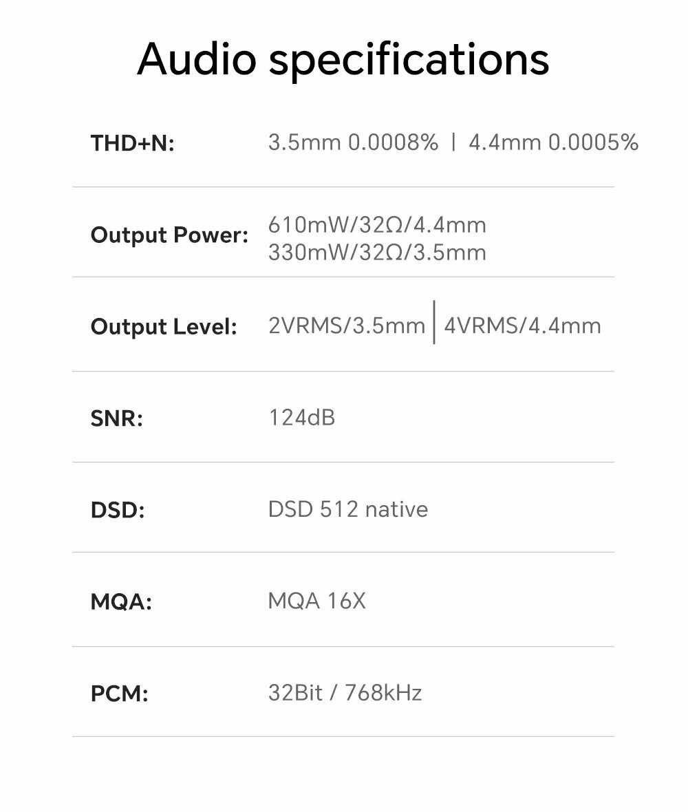 - Поддержка DSD512, MQA 16X, DXD, PCM 32bit/768khz;