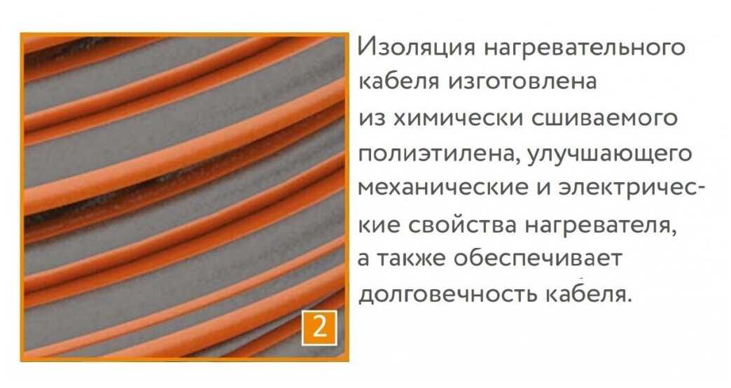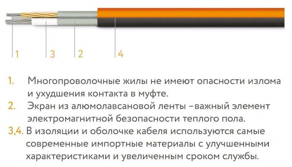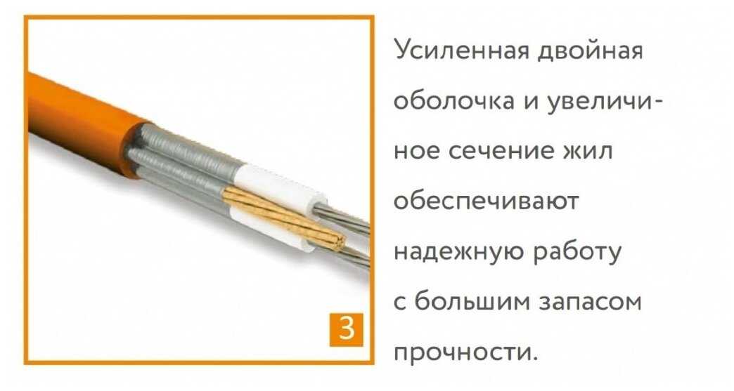 Оболочка обеспечивает механическую прочность при заливке стяжкой, исключает расплавление при перегреве и гарантирует электроизоляцию даже в сырых помещениях. Пользователи отмечают "солидный" вид кабеля и отсутствие повреждений после укладки в агрессивную цементную среду. -
