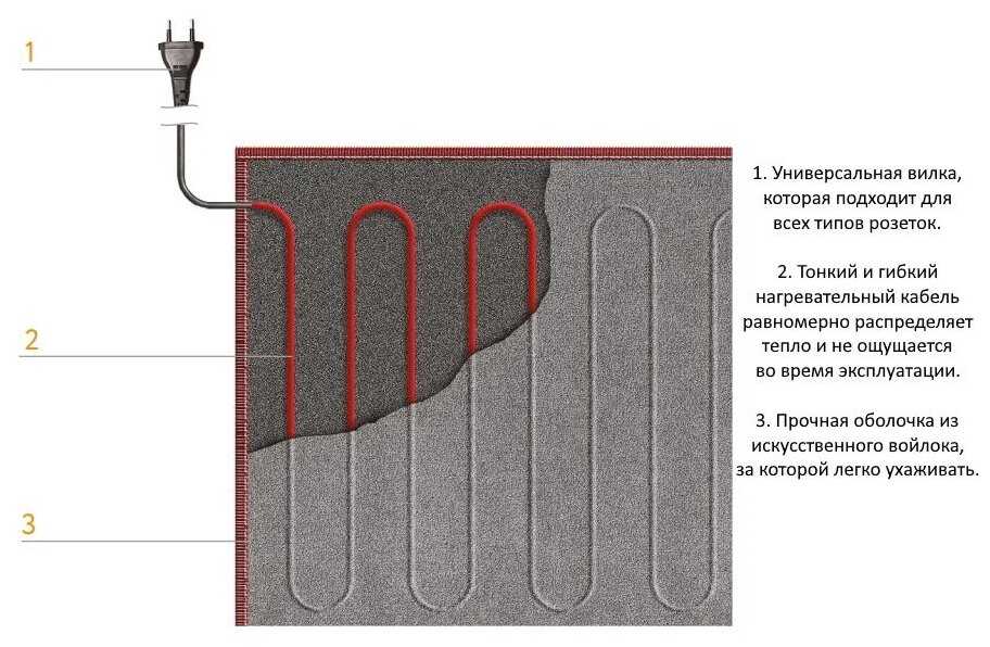 Коврик изготовлен из плотной ткани с тонкими, но надежно вплетенными нагревательными элементами, которые не ощущаются при ходьбе. Пользователи подтверждают, что при аккуратном использовании он служит годами, например, некоторые модели эксплуатируются до 5 лет без поломок. Однако материал требует бережного обращения: его нельзя ставить под мебель из-за риска повреждения кабеля. -