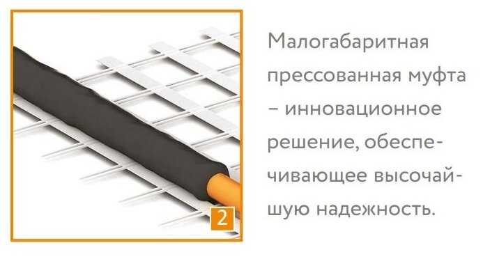 - Прочная фиксация кабеля на сетке устойчива к механическим нагрузкам, что обеспечивает стабильную работу под тяжелыми покрытиями, такими как кварцвинил или паркет.