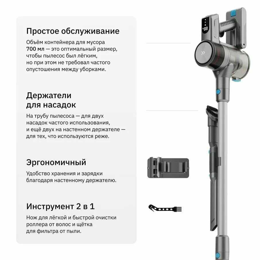 Мощный и функциональный вертикальный пылесос, идеально подходящий для сухой уборки различных поверхностей. Он обеспечивает длительное время работы и поставляется с разнообразными насадками, что делает его универсальным помощником в доме. Однако стоит учитывать время зарядки, уровень шума и вес устройства при принятии решения о покупке.