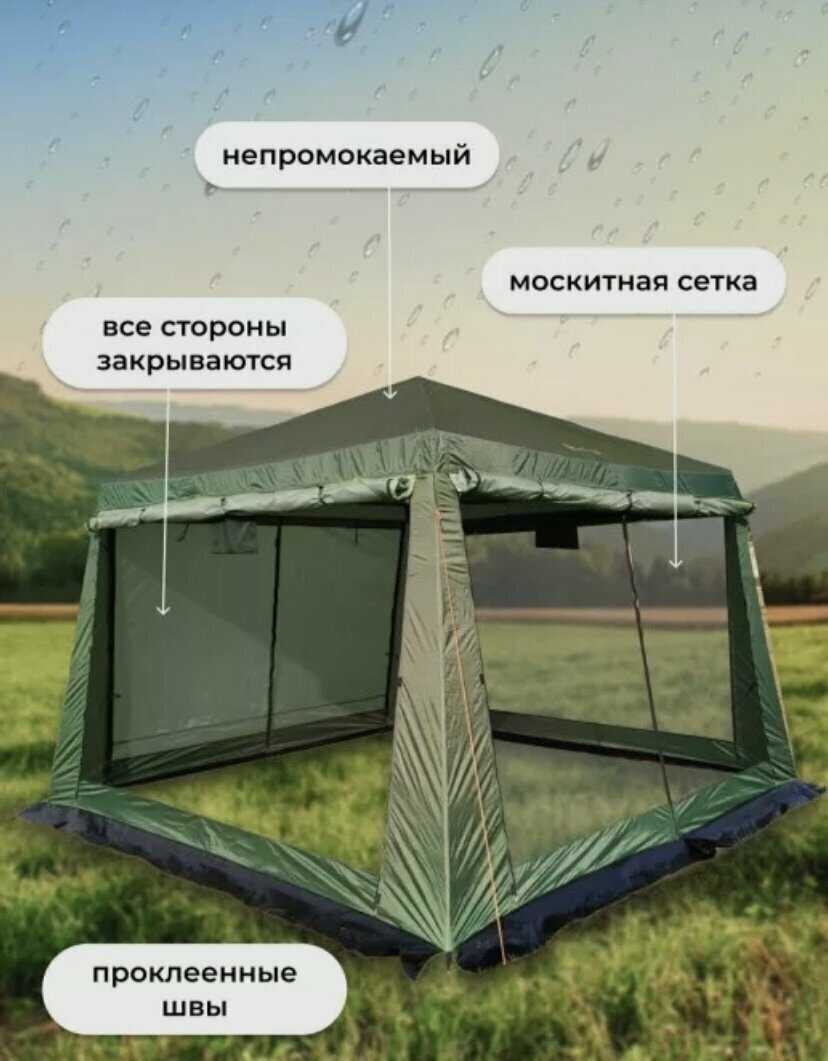 Шатер просторный (высота до 2.4 м), с удобными вшитыми карманами для мелочей и крючками для фонарей. Отсутствие пола упрощает уборку (пролитую жидкость можно засыпать землей), но для комфорта рекомендуют использовать отдельное напольное покрытие. -