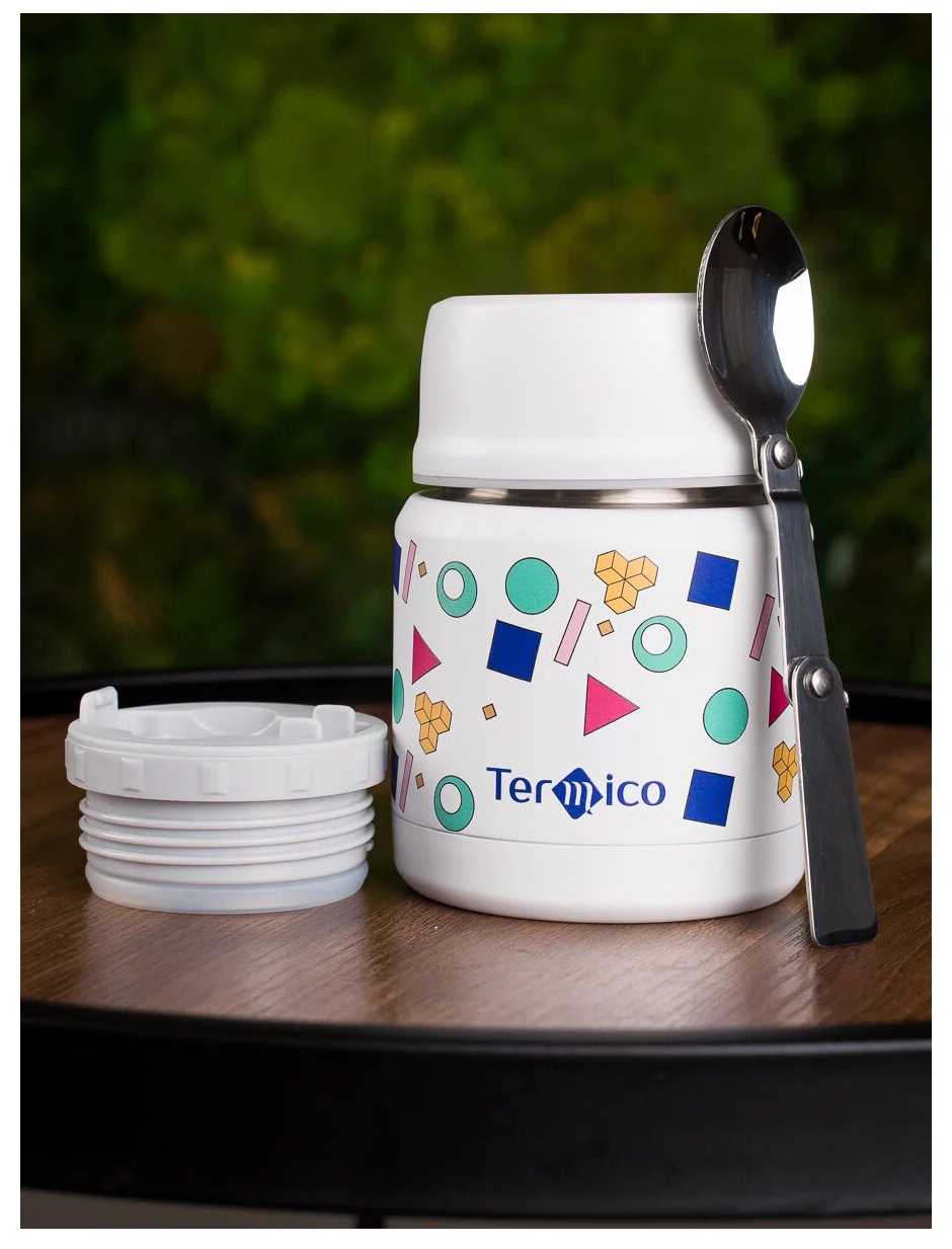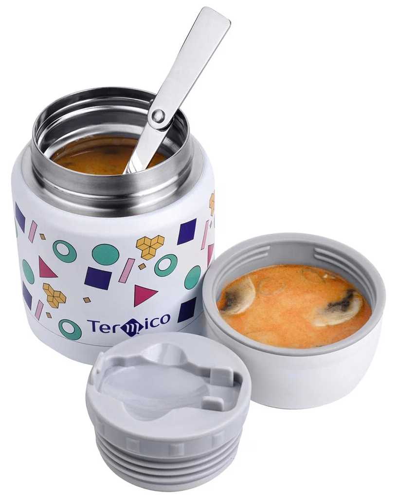 - + Ребёнку удобно брать обед в школу. Термос лёгкий и занимает немного места в портфеле. В комплекете есть ложка и место под соус или орешки.