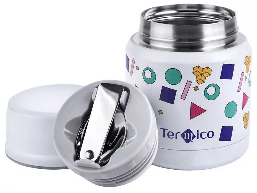 - + Не протекает. Держит тепло около 5 часов. Удобный, есть ложечка в комплекте)