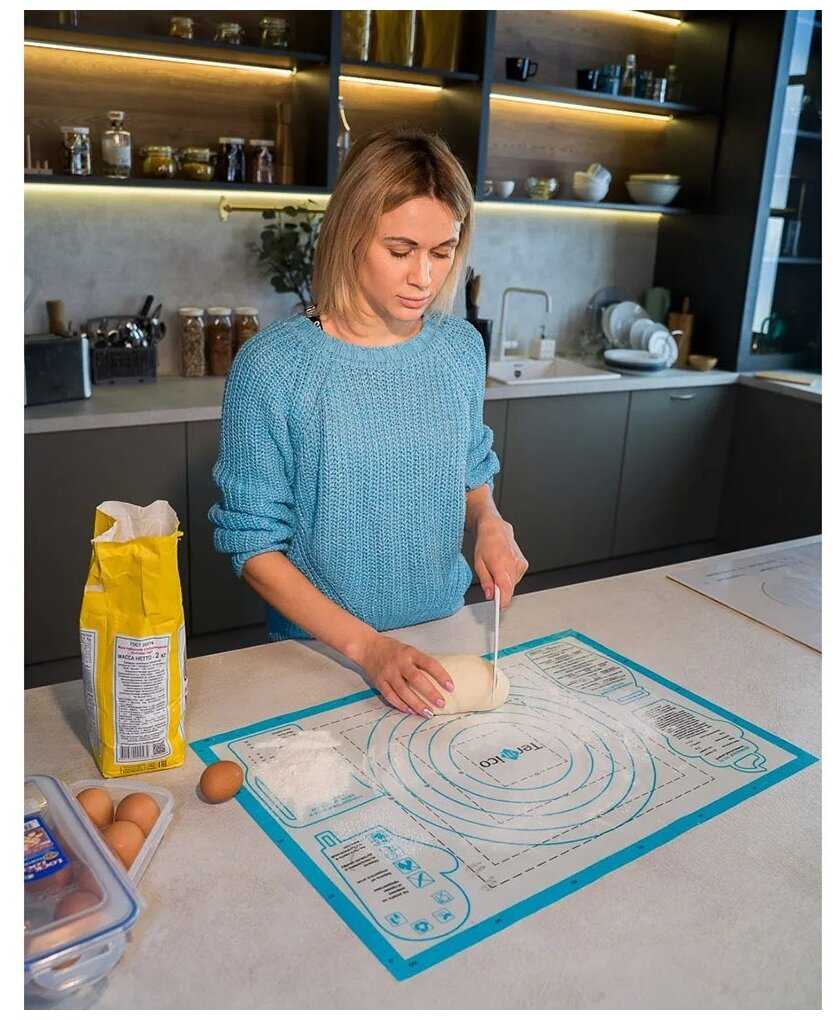 - + коврик понравился. по столу не скользит , удобно раскатывать тесто.