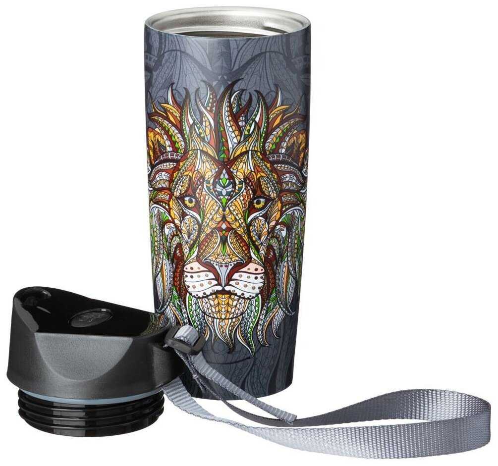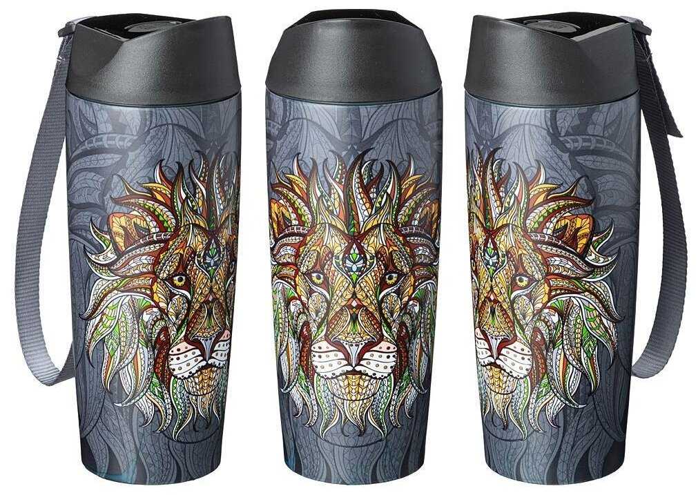 7/10 балловAgness Термокружка "Лев" с кнопкой-стоппером и удобным ремешком для перенокси, 380мл колба нерж. стал