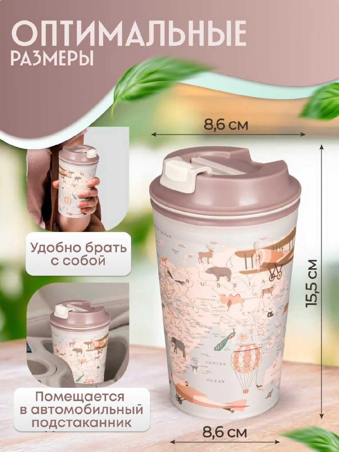 phibo термостакан с крышкой и декором, цвет тёмно-бежевый, объем 400 мл, рисунок микс