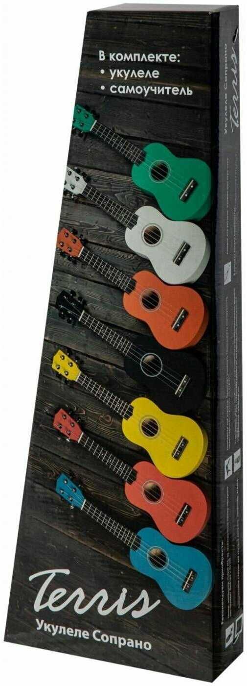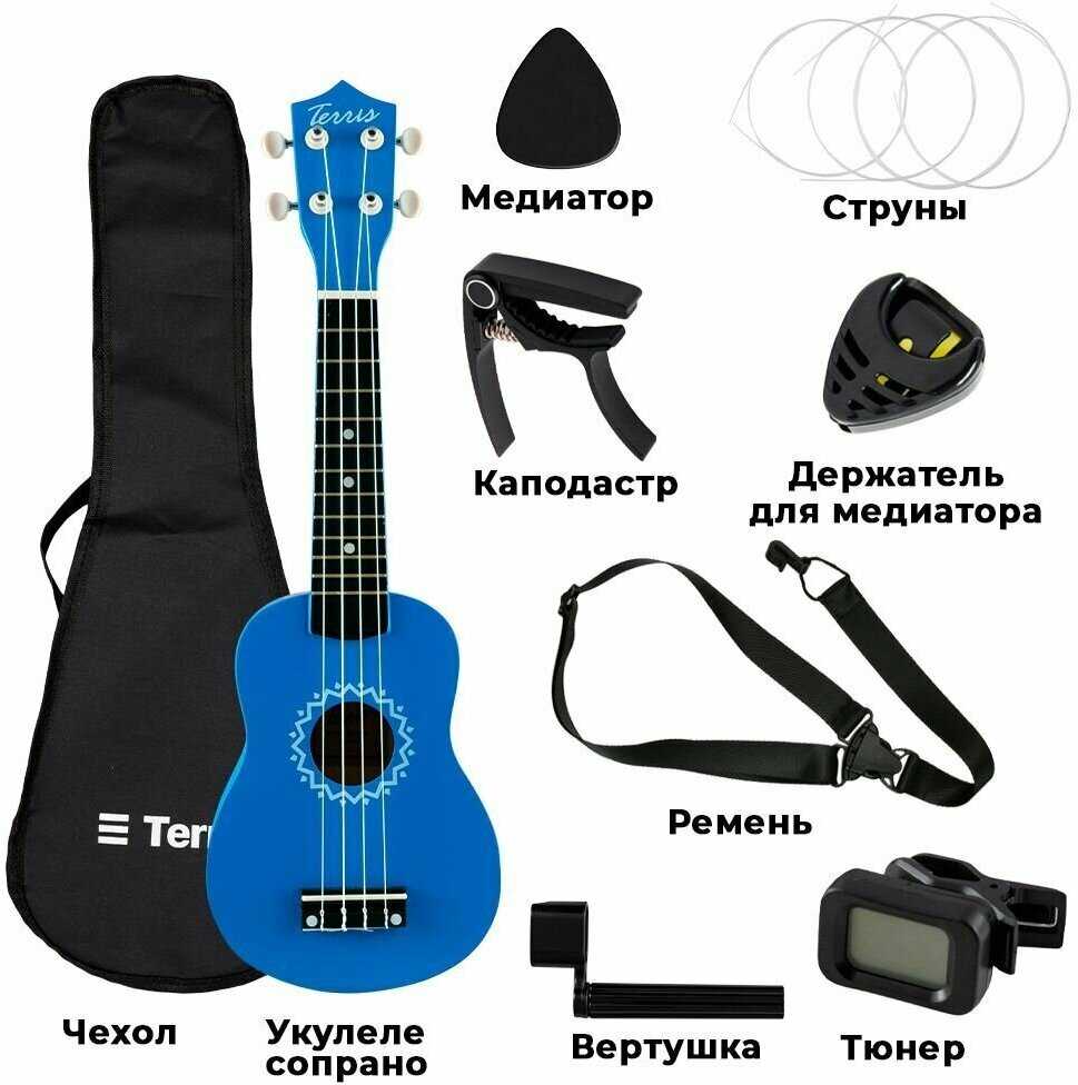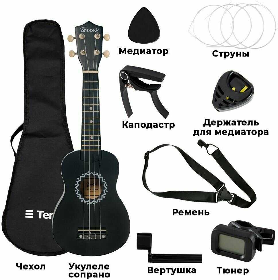 В комплекте : | укулеле — размер сопрано, чехол, тюнер, ремень, каподастр, держатель для медиатора и медиатор, струны, вертушка |