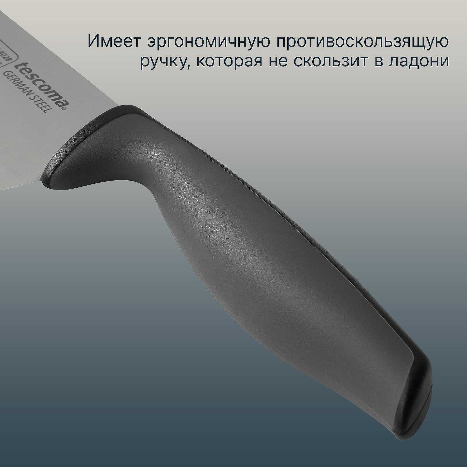 - + Хорошая серия ножей от Tescoma. Качественная сталь и заточка. Удобная ручка, приятно лежит в руке. Работать таким ножом - одно удовольствие!