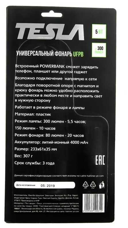 | Дополнительная информация : | мощность (вт): 5.0, встроенный пауэрбанк для зарядки телефона и других устройств, поворотная опора с магнитом, работает в режиме фонаря и лампы, режим лампы: 300 люмен - 55 часов 150 люмен - 10 часов, режим фонаря: 80 люмен - 20 часов, тип аккумулятора: Li-ion, тип батарей: ICR18650, время зарядки аккумулятора: 4 ч, потребление питания: от сети |