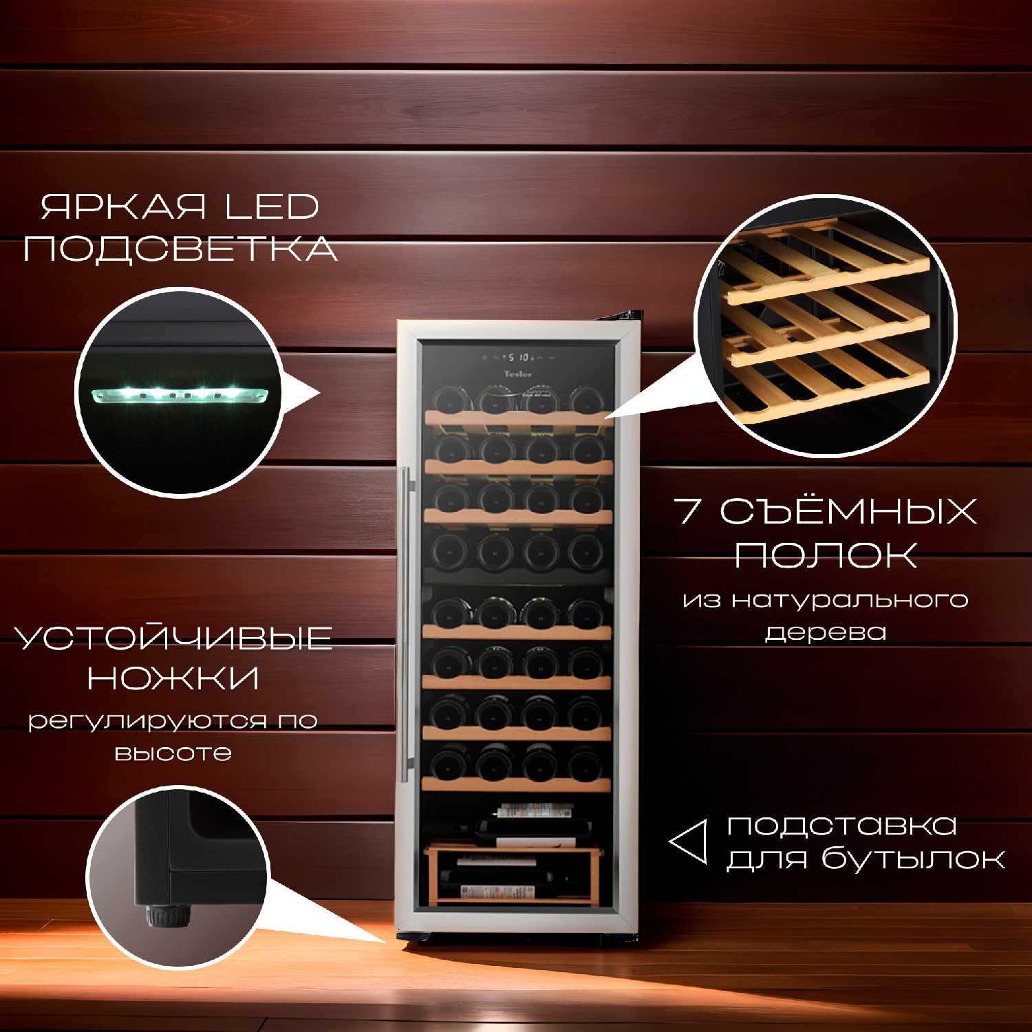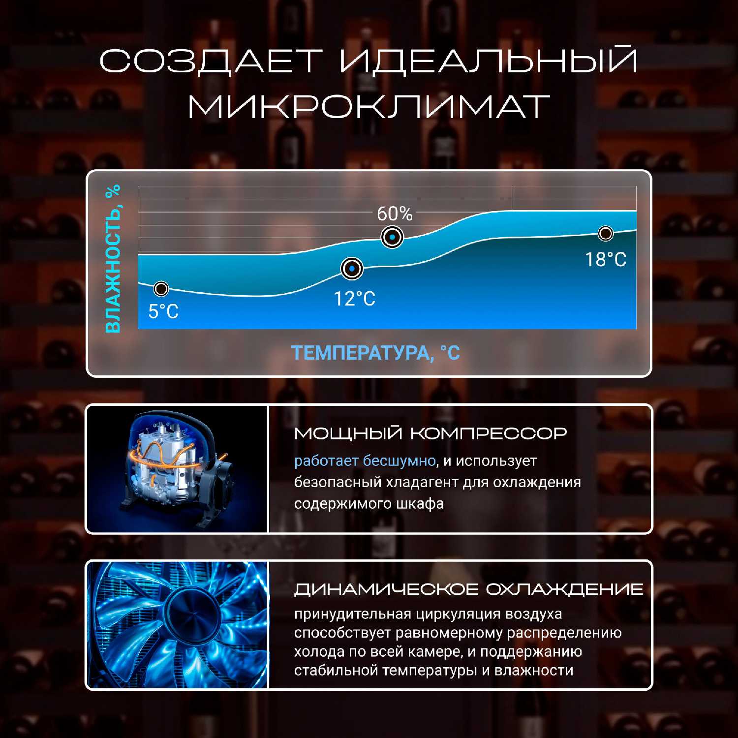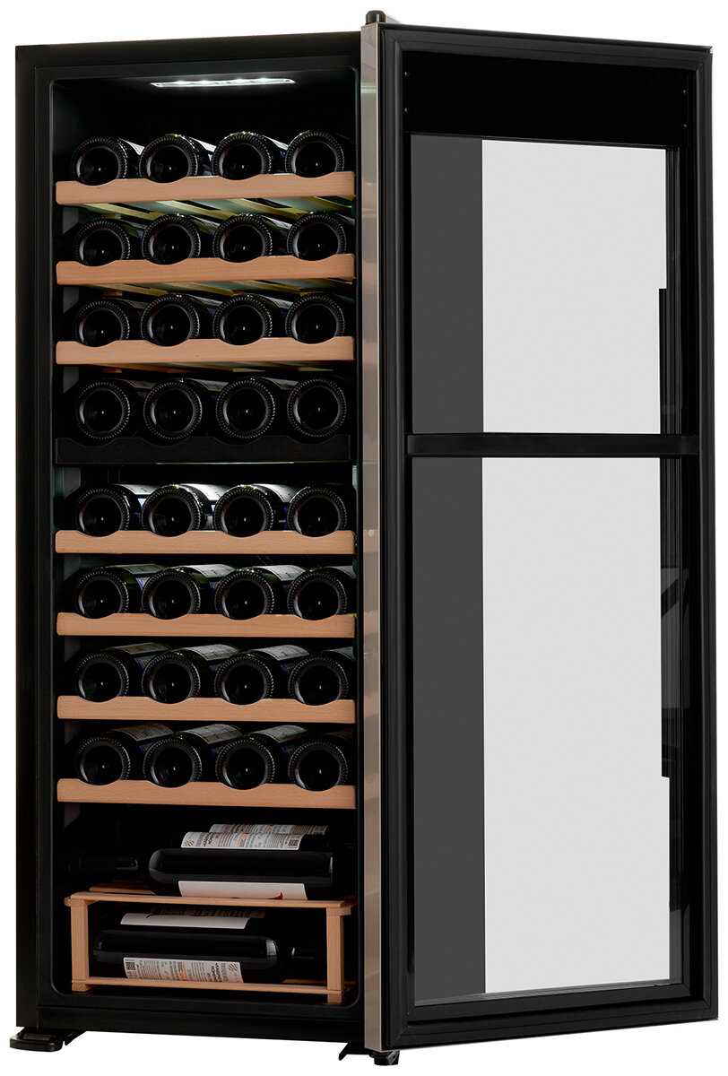 - + Приятный вид, две камеры, на много бутылок, деревянные полки, подсветка.