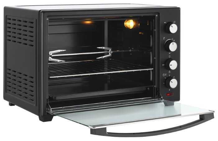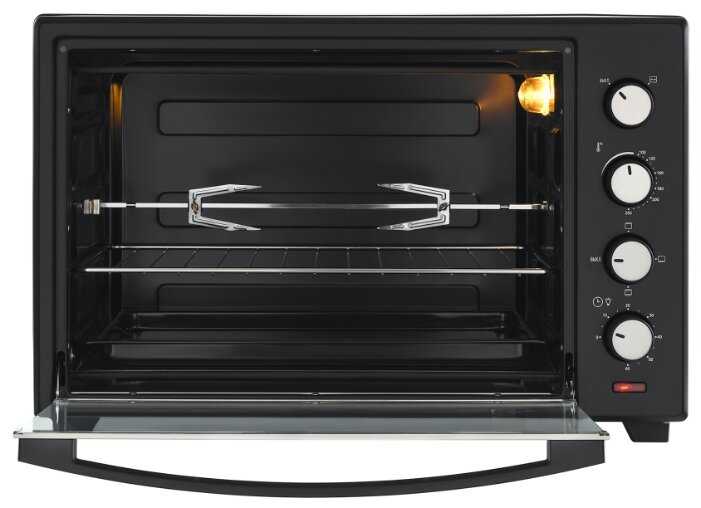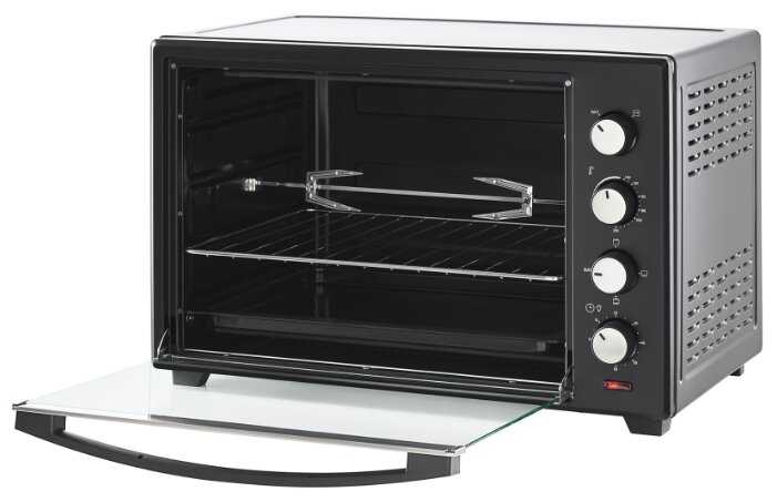 - + Печь отличная: 2 тена, честно держит температуру, гриль работает, вертел крутится, есть таймер. Жарит и печёт. Лёгкая, объём 60 литров!! Несмотря на отсутствие термоизоляции, корпус печи снаружи не греется: в разогретом по максимуму состоянии можно спокойно держать руку на верхней стенке печи, - единственная греющаяся поверхность - стекло, при этом ручка всегда холодная.