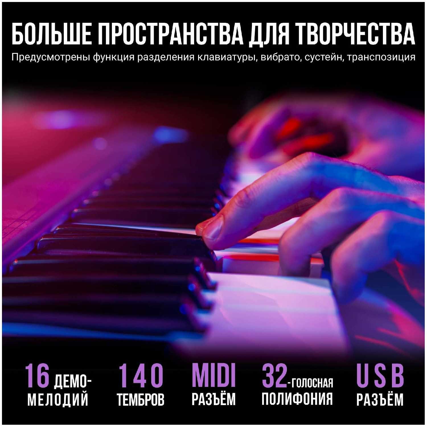 Функции и опции : | арпеджиатор, дисплей, запись песен, метроном, обучение, разделение клавиатуры, русский язык, транспонирование, чувствительность клавиатуры к касанию |