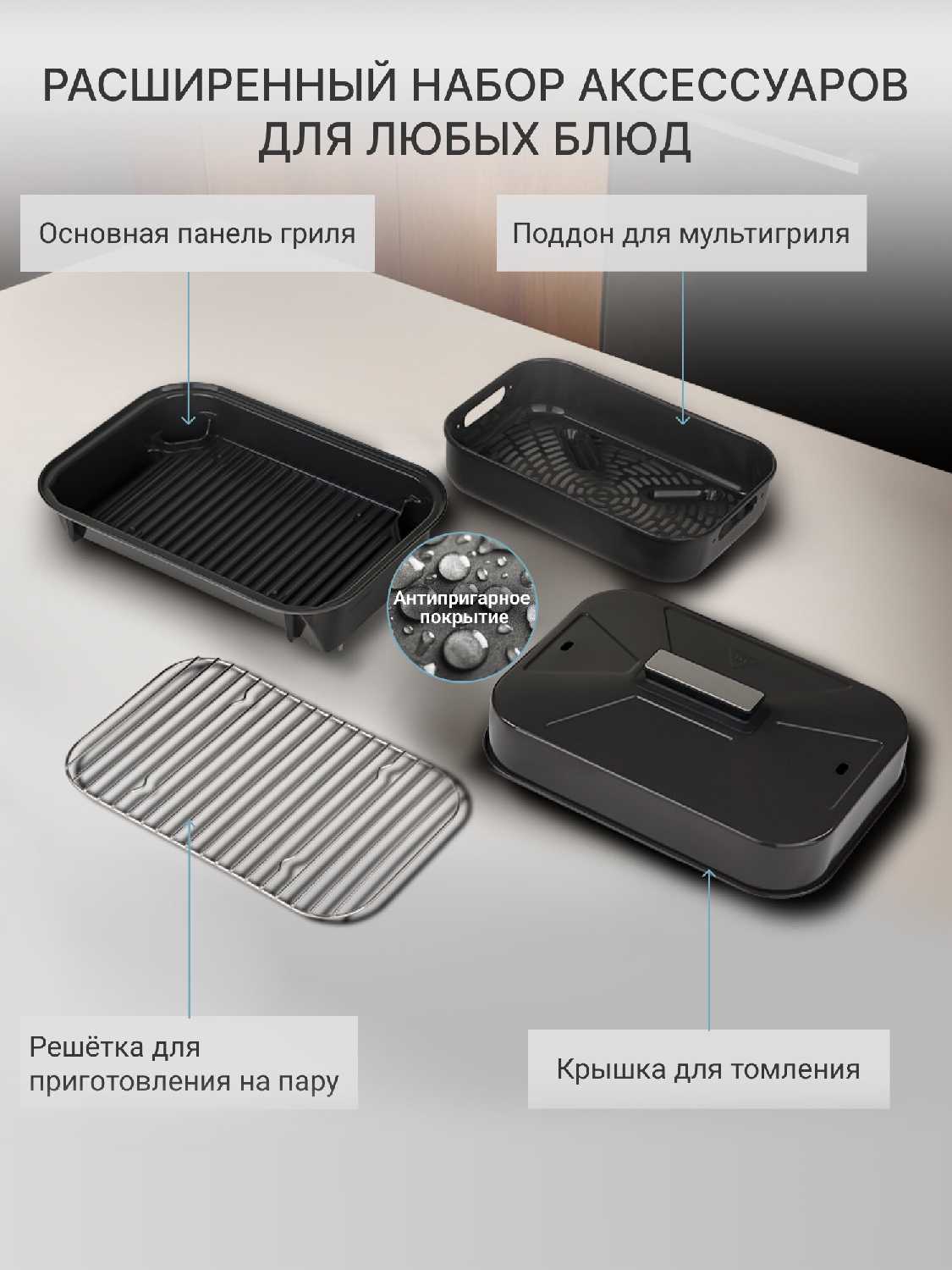 | Особенности : | антипригарное покрытие, крышка, поддон для сбора жира, решетка |