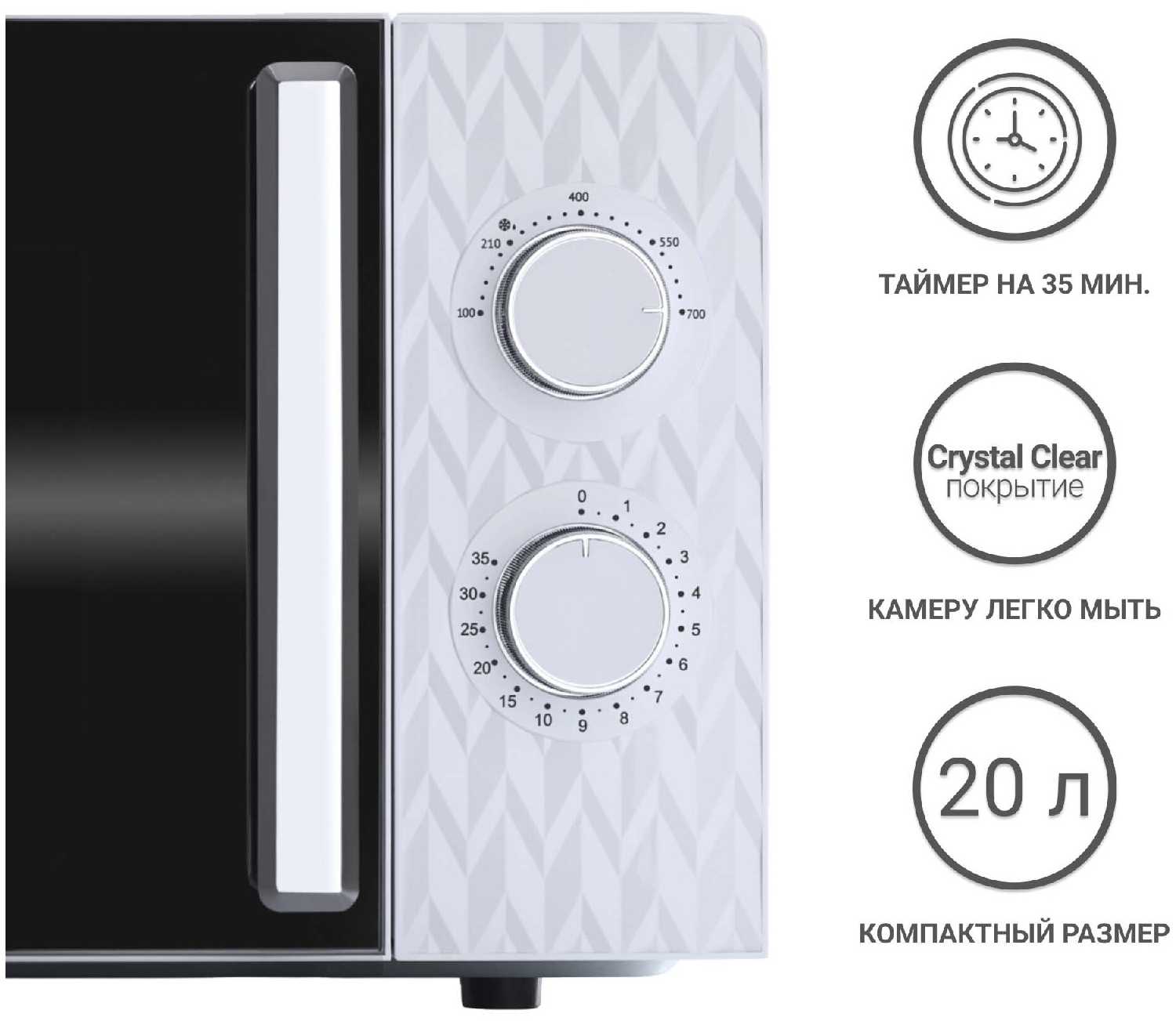 Идеальна для тех, кто ценит лаконичный дизайн и базовые функции. Благодаря простому управлению её рекомендуют пожилым людям и дачникам. Не подойдёт пользователям, нуждающимся в быстром разогреве больших порций или сложных автоматических программах.