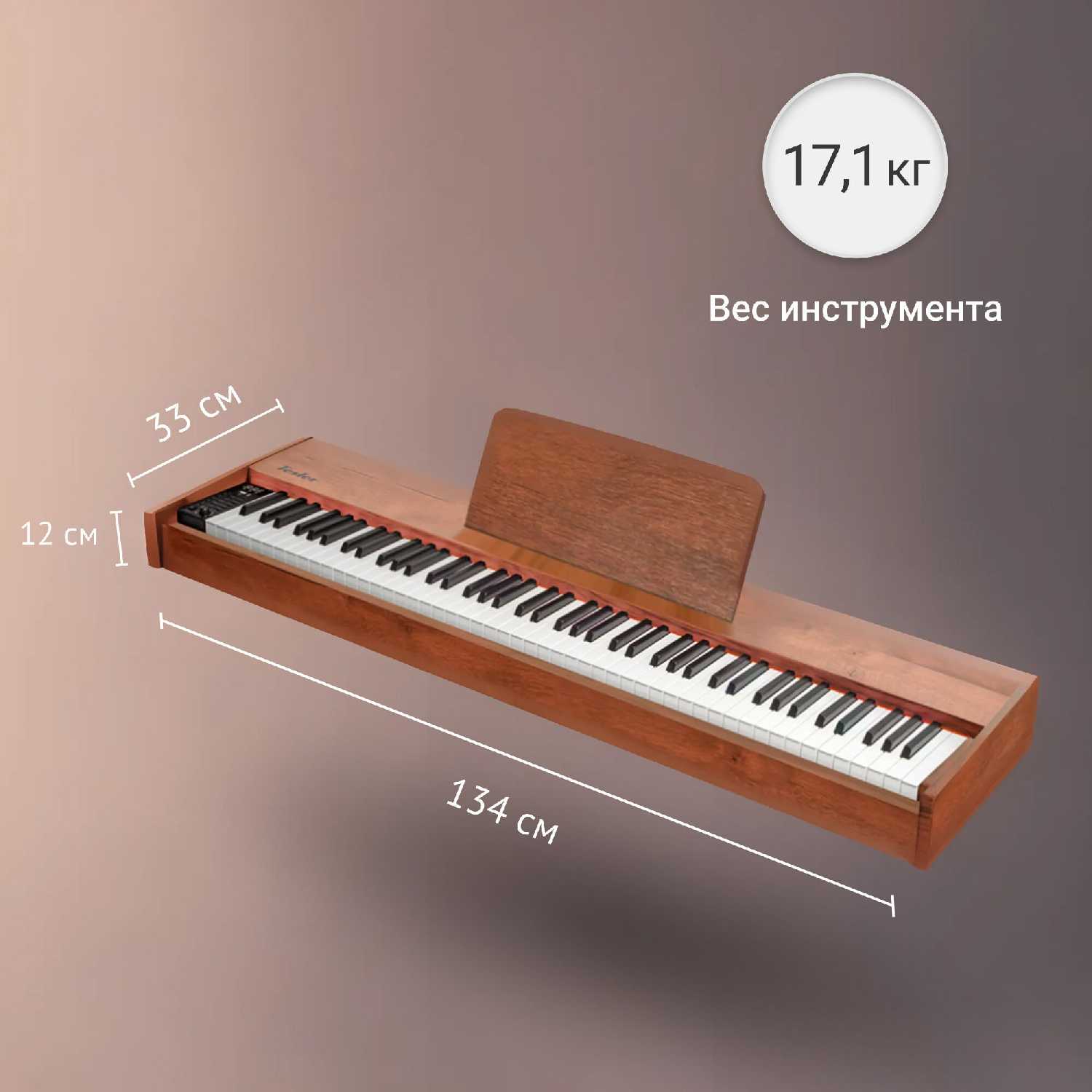 Пианино довольно тяжёлое, что придаёт устойчивость, но затрудняет переноску. Пользователи называют вес ощутимым, не лёгким для мобильности в авто. Для стационарного домашнего использования это плюс. В малогабаритных помещениях оно размещается без проблем. Перенос возможен вдвоём. -