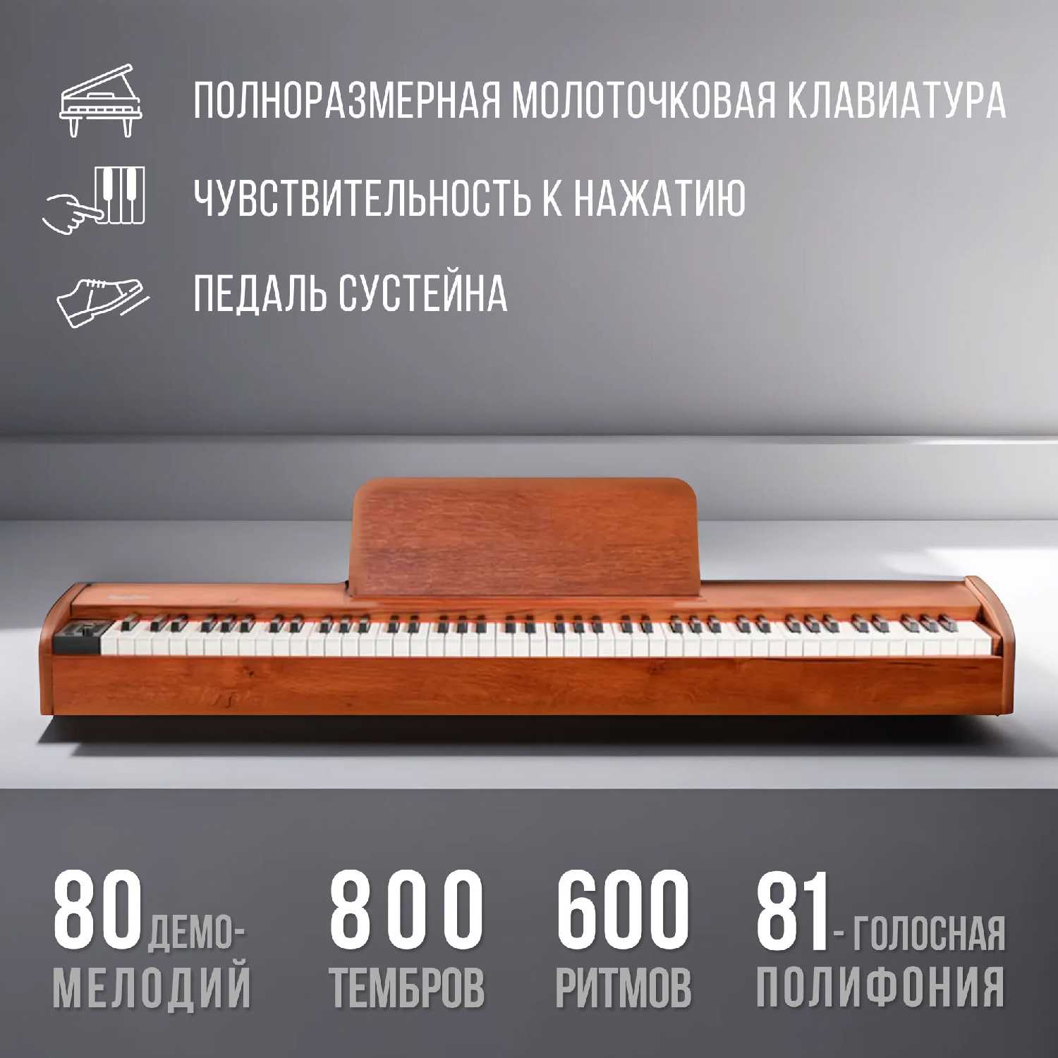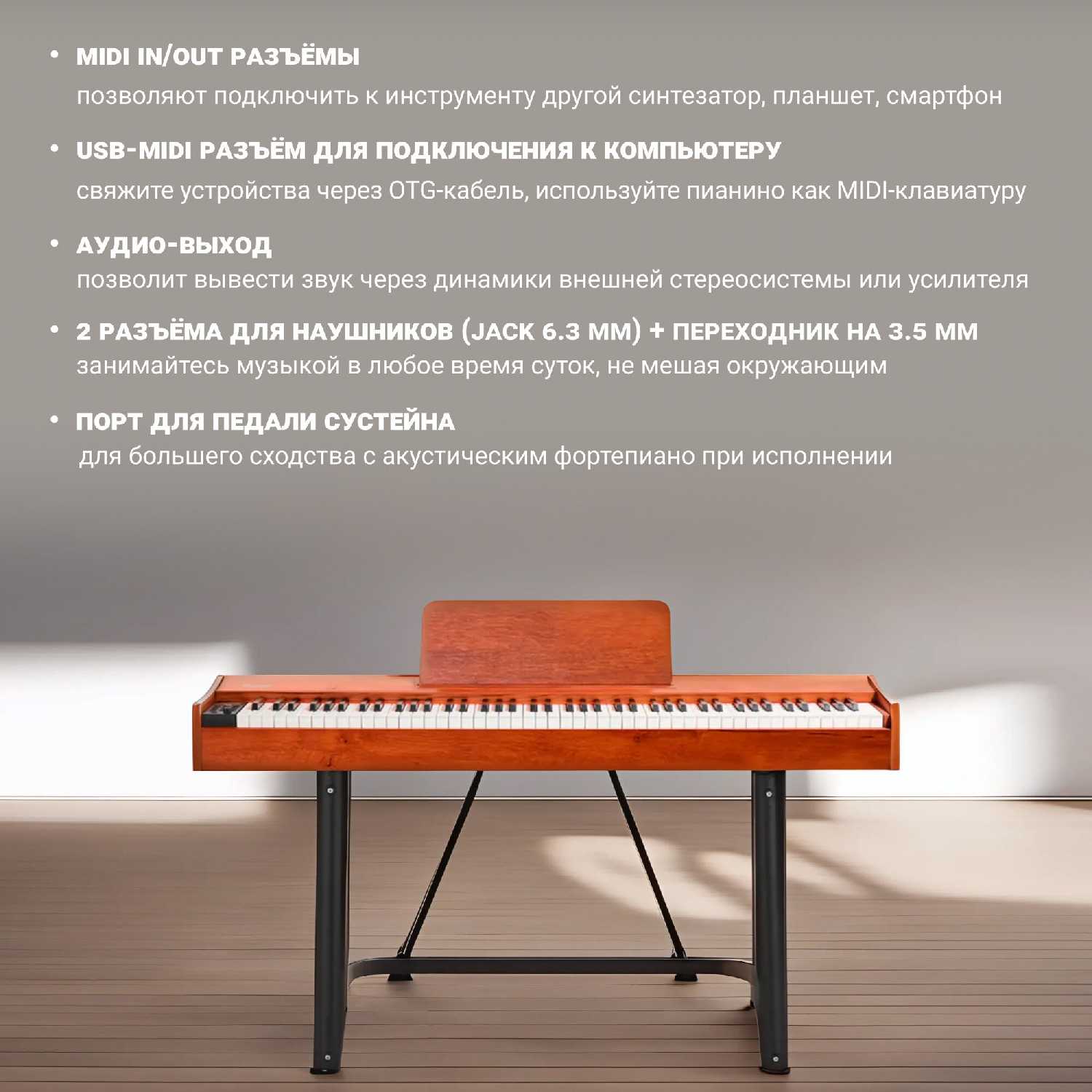 - Полноразмерные клавиши с оптимальным сопротивлением нажатия позволяют комфортно играть этюды и простые пьесы, не отличая от механики.