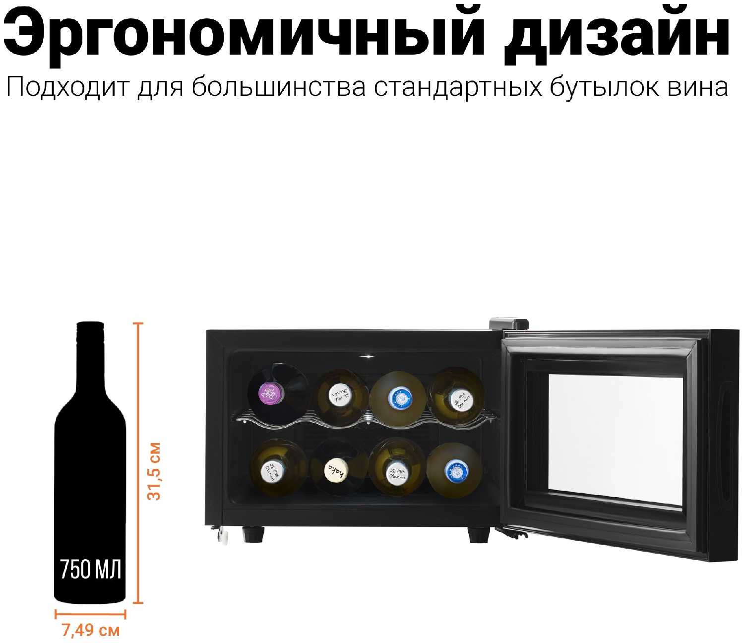8 бутылок помещается легко. Заданную температуру держит,. что ещё надо? температуру проверил электронным радио датчиком от метеостанции, все четко