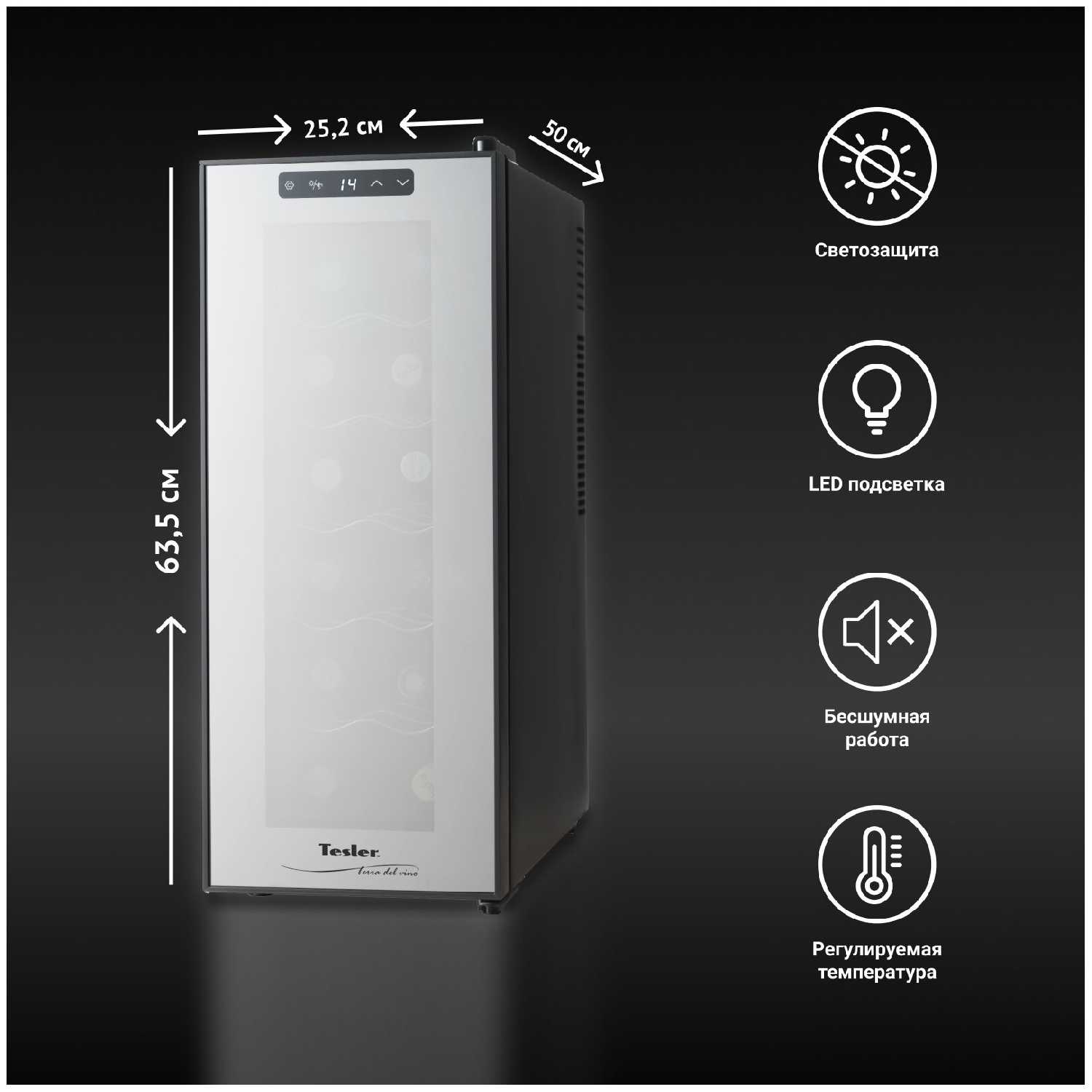 - + На 12 бутылок оптимально, размером с обычный системный блок, прекрасно размещается рядом. Когда выходит на заданную температуру, тихий. Хорошая подсветка.