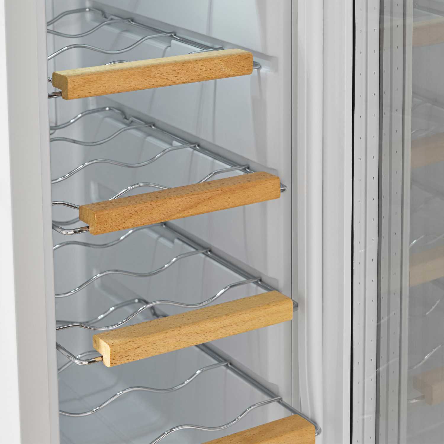 - - температуру держит плохо, при 30 снаружи ниже 15 не охлаждает. дизайн полок неудачный, по размеру и наклону ряд бутылок лежат очень неловко