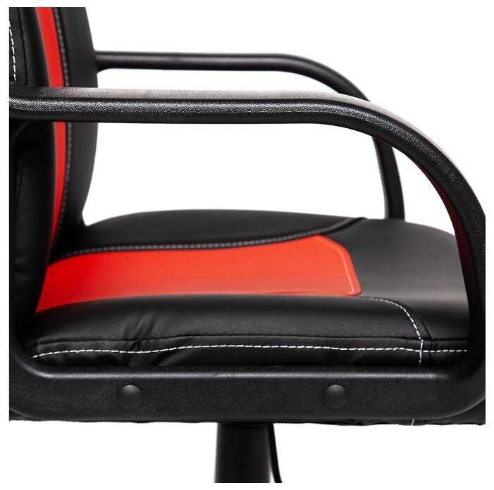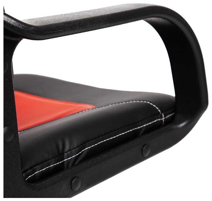 Выглядит как геймерское кресло - строгий черный цвет с красными вставками по середине