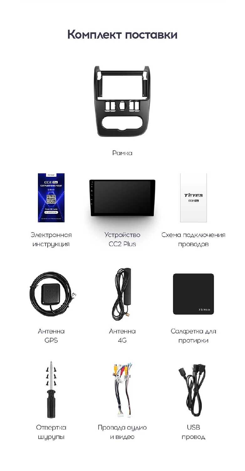 Экран, Рамка для установки в штатное место, комплект всех необходимых проводов, Антенна GPS, Антенна 4g, Антенна 5g Wi-Fi, USB провод, Шурупы и отвертка, Салфетка для протирания, Схема подключения проводов