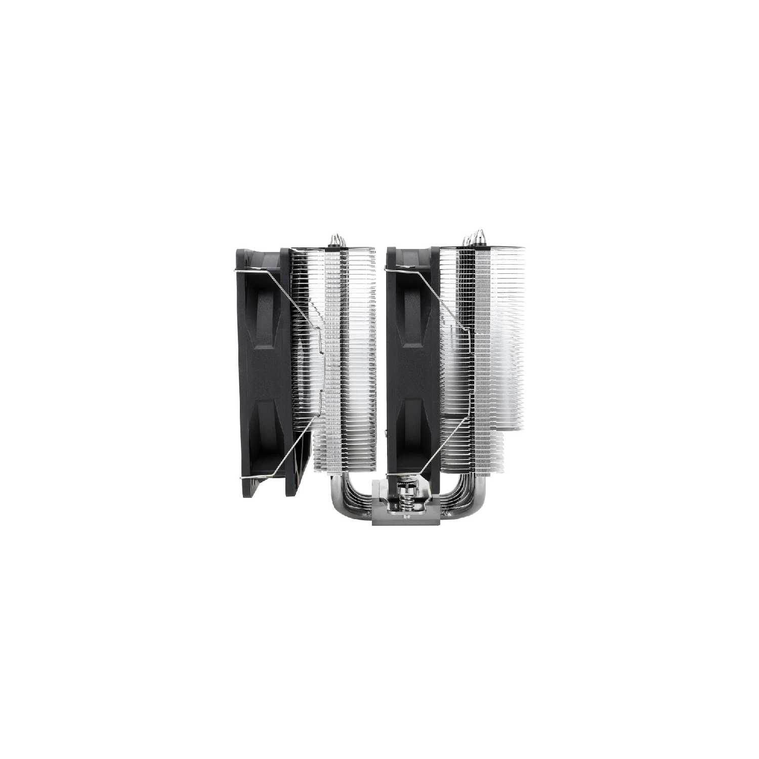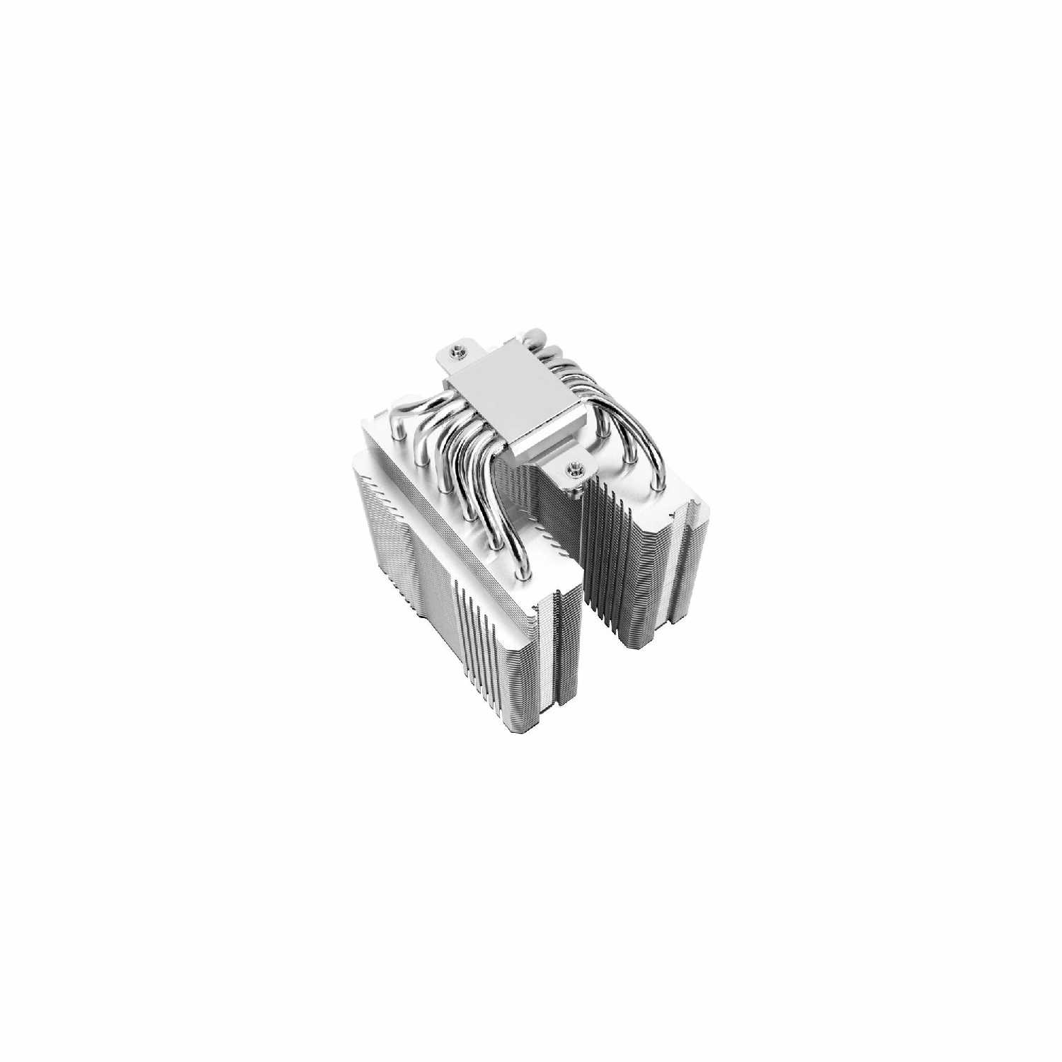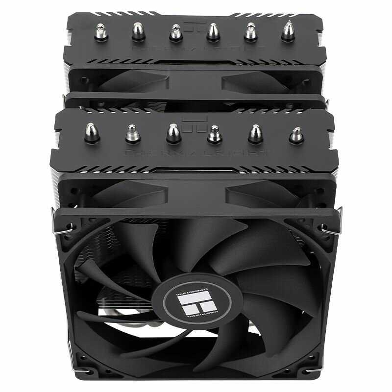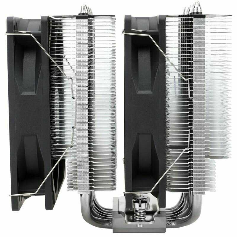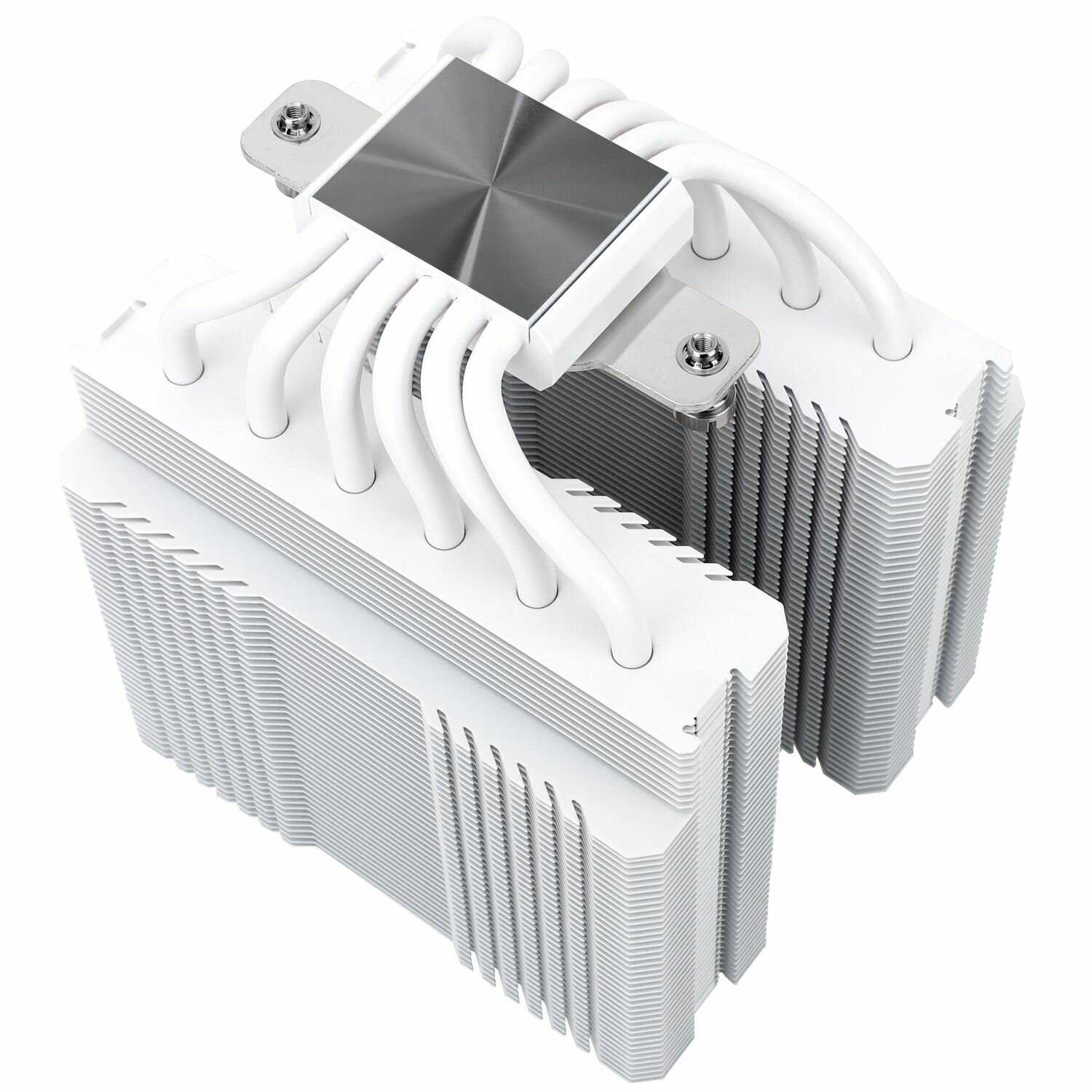 Шесть тепловых трубок и цельная никелированная база обеспечивают равномерное распределение тепла, но плотное расположение пластин радиатора ограничивает продуваемость. Комплектные вентиляторы с гидродинамическими подшипниками можно заменить на Arctic для снижения шума и улучшения воздушного потока. Пластины радиатора подвержены деформации при монтаже, что требует осторожности. База имеет ровную поверхность, обеспечивая оптимальный контакт с процессором. -