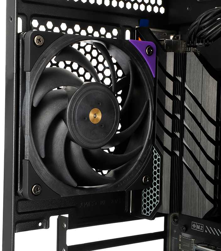 - Сохраняет производительность даже с фильтрами и сетками перед вентилятором, где другие модели слабеют.