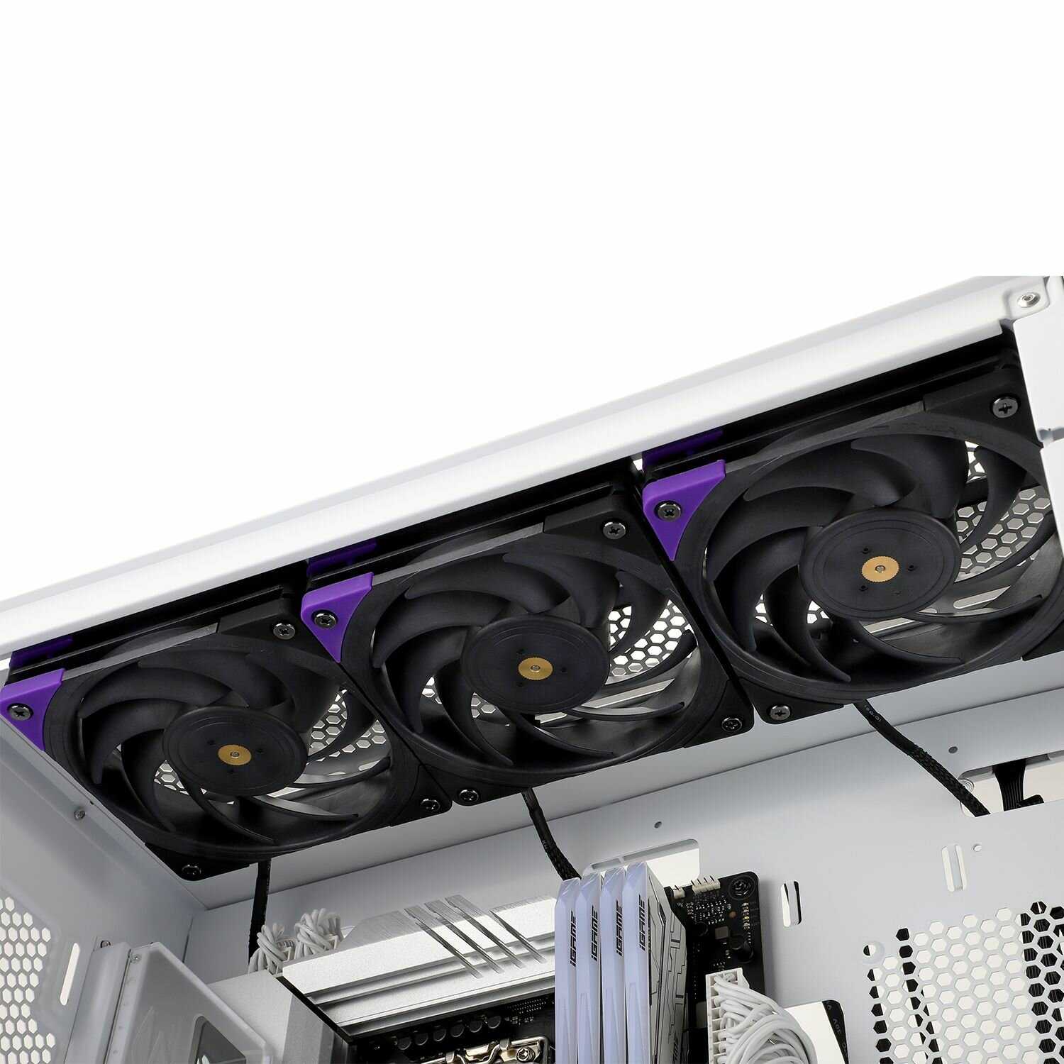 - В каждом вентиляторе идёт разветвитель PWM для двух в один разъём, сменные резиновые накладки (чёрные и сиреневые), болты, гайки, саморезы и дополнительный крепёж.