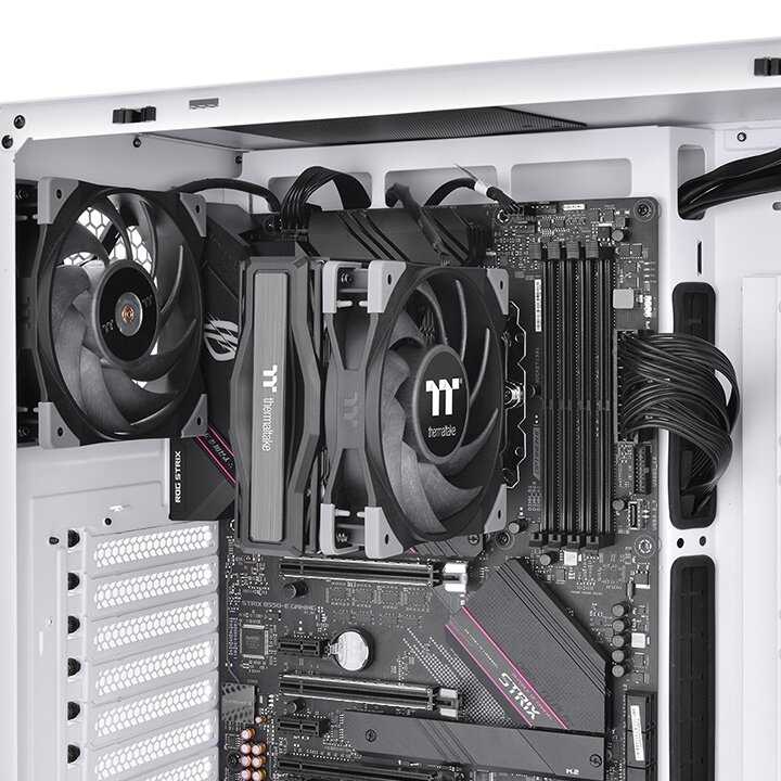 Глянцевая поверхность отражает RGB-подсветку корпуса, создавая эффект внутреннего свечения без встроенных светодиодов. В прозрачных корпусах из акрила или стекла это усиливает эстетику, особенно при симметричном расположении относительно сокета. Однако для яркой индивидуальной подсветки потребуется замена вентилятора на модель с ARGB. -