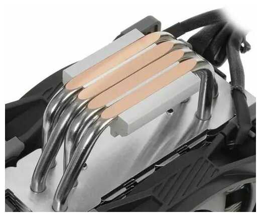 - Конструкция из 4 тепловых трубок с прямым контактом и массивным алюминиевым радиатором обеспечивает быстрое рассеивание тепла.