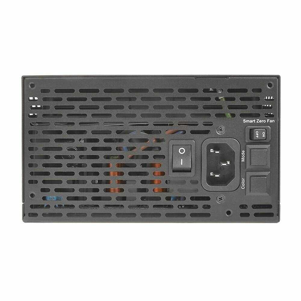 Блок питания оснащен полупассивной системой охлаждения с функцией Smart Zero Fan. В режиме низкой нагрузки (примерно до 20-30% от номинальной мощности) вентилятор полностью останавливается, обеспечивая абсолютную тишину. При повышении температуры или нагрузки кулер плавно запускается. Некоторые пользователи отмечают, что в момент старта вентилятор может издавать легкий щелчок, но в целом его работа под нагрузкой оценивается как тихая, особенно на фоне других компонентов системы, таких как видеокарта или процессорные кулеры. -