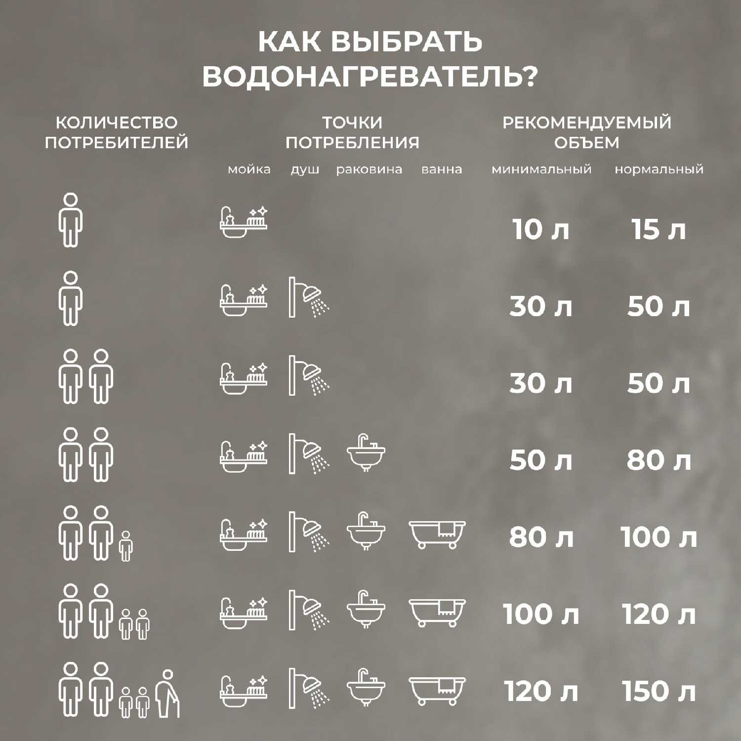 1. Оптимальный объем и потребление (хватает на семью из трех человек, если не сидеть долго в ванной);