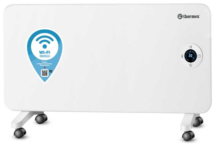 - Встроенный Wi-Fi-модуль позволяет управлять конвектором через приложение Thermex Home или голосовые помощники (Алиса, Tuya Smart).