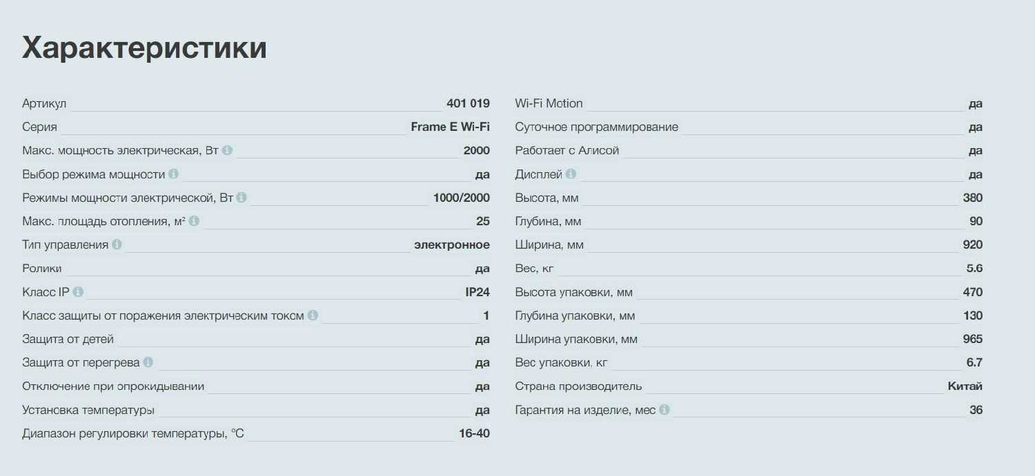 | Дополнительная информация : | напряжение: 220/230 В, режимы мощности 1000/2000 Вт, максимальное время установки таймера: 24 ч, выключатель со световым индикатором, управление со смартфона по WI-Fi (Wi-Fi Motion) голосовой помощник - Алиса |