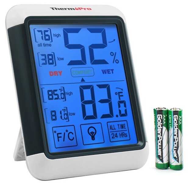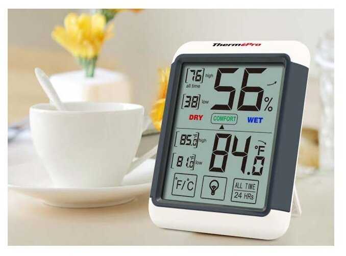 Удобно, что и "вешалка" есть, и подставка, и магниты. Имеется некоторое количество настроек: Цельсий/Фаренгейт, а также период, за который фиксируются максимальные показатели. Удобно, что показывается не просто влажность, а пределы комфорта (чтобы не запоминать именно число, к которому нужно стремиться).