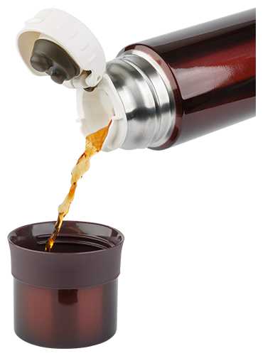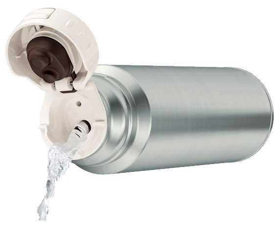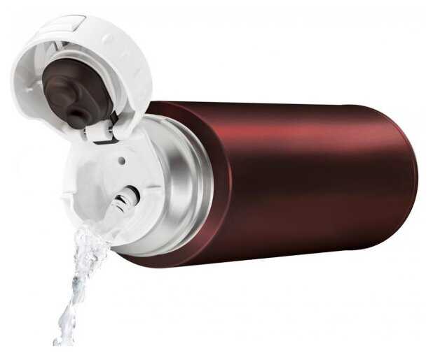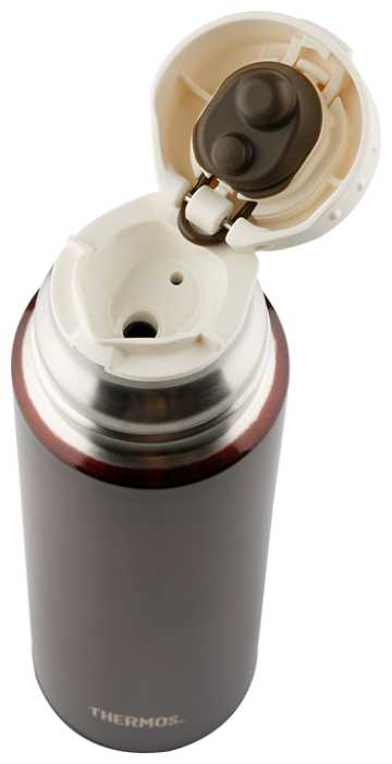 Хороший термос для занятия спортом, поскольку можно открывать-закрывать одной рукой. Цвет коричневый, ближе к кофейному. Сначала снимаю кольцо, нажимаю на кнопку и откидывается крышка. Поильник удобный. Температура держится 10-12 часов, для меня идеально
