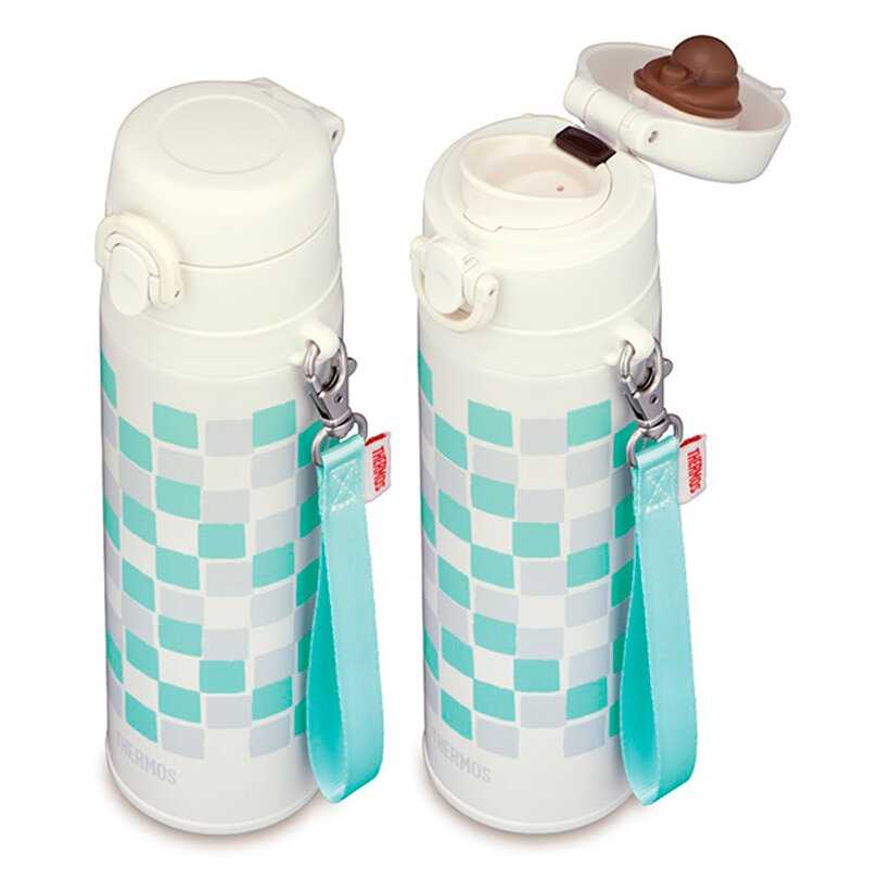 - + Отличный термос от известного производителя, открывается одной рукой, есть страховочное кольцо для предотвращения случайного открытия. У Thermos много похожих моделей, эта отличается удобным ремешком (из-за этого объем чуть больше стандартного - не 0,5, а 0,55). При этом диаметр термоса остался стандартным, т.е. он влезает в обычные подстаканники.