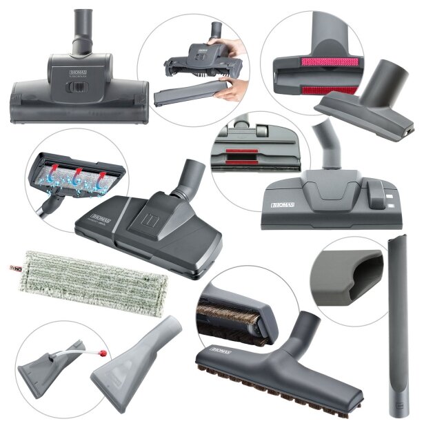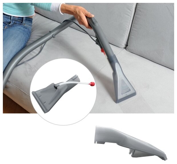 - В набор входят турбощетка для ковров, щелевая насадка для труднодоступных мест, а также насадка для влажной уборки мягкой мебели.