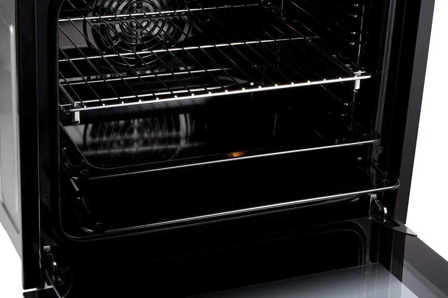 - Вентилятор конвекции равномерно распределяет тепло, позволяя готовить на двух уровнях одновременно без подгорания или недопекания, что улучшает качество выпечки и мяса.