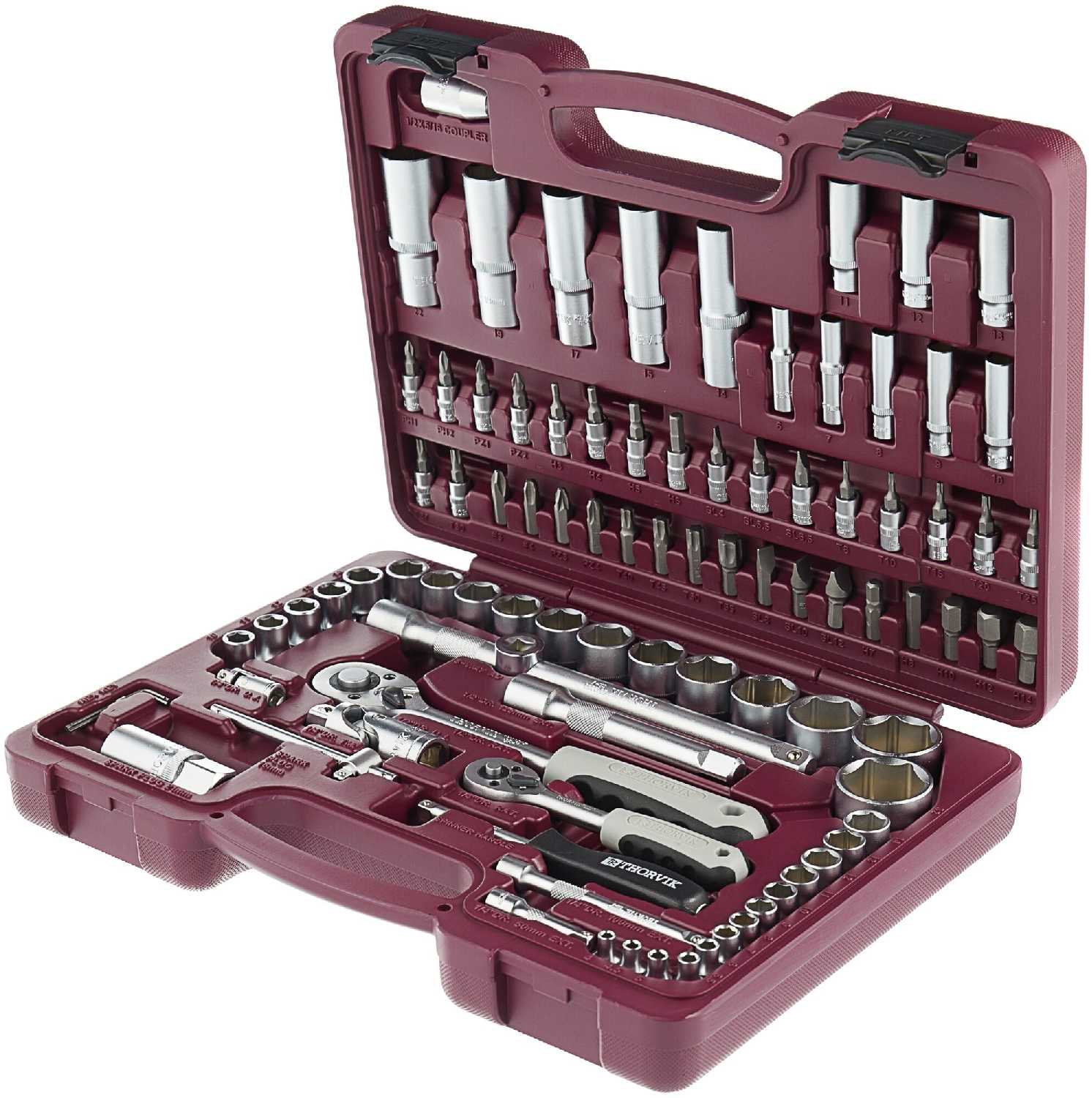 | Головки торцевые подробно : | с битами 1/4": SL4 SL5.5 SL6.5 H3 H4 H5 H6 T8 T10 T15 T20 T25 T30 PH1 PH2 PZ1 PZ2, трещотка 1/4", вороток т-образный 1/4", удлинитель 1/4": 50 100 мм, карданный шарнир 1/4", 1/2" (12-гр): 10 11 12 13 14 15 16 17 18 19 21 22 24 27 30 32 мм, длинные 1/2" (12-гр): 14 15 17 19 22 мм, трещотка 1/2", карданный шарнир 1/2", свечные 1/2": 16 21 мм, удлинитель 1/2": 125 250 мм |