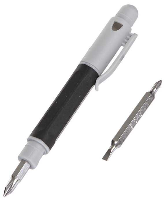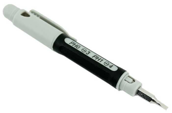 - + Интересная отверточка для мелких работ. корпус софт-пластик, биты вставляются с обеих сторон, удобно носить в кармане пиджака вместе с авторучками
