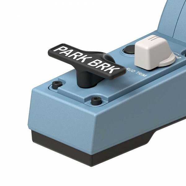 Конструкция максимально приближена к сайдстику Airbus A320: рукоятка с углублением под ладонь, фирменная красно-серая расцветка и расположение органов управления. Ключевая особенность — возможность переключения под левую руку (основной режим для Airbus) путём физической замены боковых кнопок. Однако эргономика имеет нюансы: кнопка над курком расположена слишком высоко, требуя неестественного вытягивания пальца, а сам курок имеет длинный холостой ход — реальное срабатывание происходит только в конце движения. Встроенный миниатюрный РУД на основании с зоной реверса полезен для базового контроля тяги, но не заменяет полноценный квадрант.