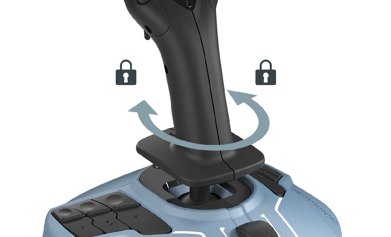 Датчики Холла по осям X/Y обеспечивают разрешение 16 бит (65,536 точек) — это исключает "ступенчатость" при плавных манёврах. Центральная пружина настроена на жёсткое усилие (~3.5N), что даёт тактильную связь с виртуальной гидравликой, но утомляет при длительных полётах. Ось Z (поворот ручки для управления рулём направления) реализована через потенциометр — её ресурс составляет 6-12 месяцев активного использования, после чего появляются "фантомные" срабатывания. Блокировка этой оси фиксатором решает проблему при подключении педалей. На базе есть 14 программируемых кнопок — достаточно для A320, но мало для комплексных симуляторов вроде DCS.