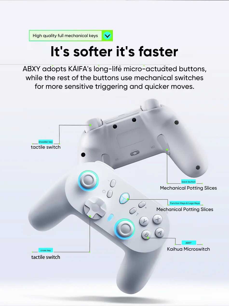 - + Хорошие стики на уровне Xbox. Некоторые кнопки механические. Подсветка, конечно, интересная, но на любителя)