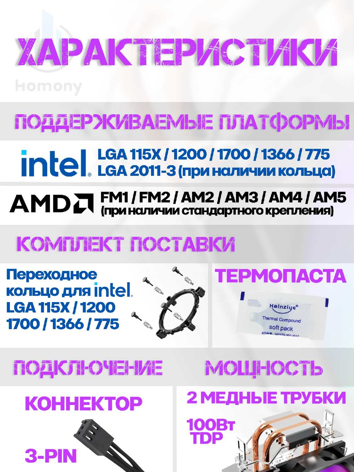 Характеристи Tianjifeng Башенный кулер (2-теплотрубки 92мм RGB)