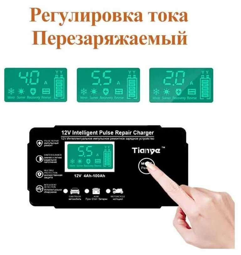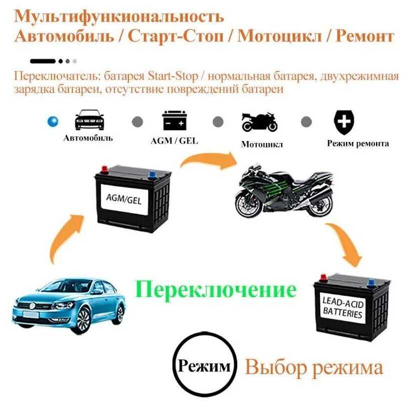 Функции : | автоматическое отключение зарядки, встроенный амперметр, встроенный вольтметр, подходит для AGM/GEL аккумуляторов, режим зимней зарядки |
